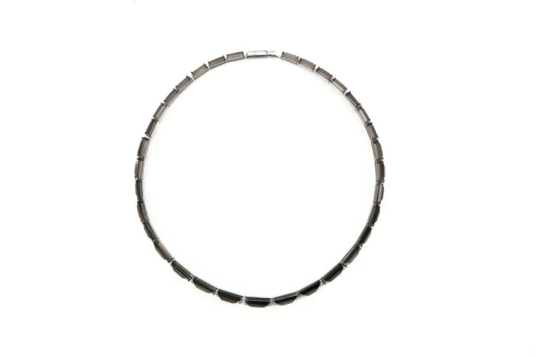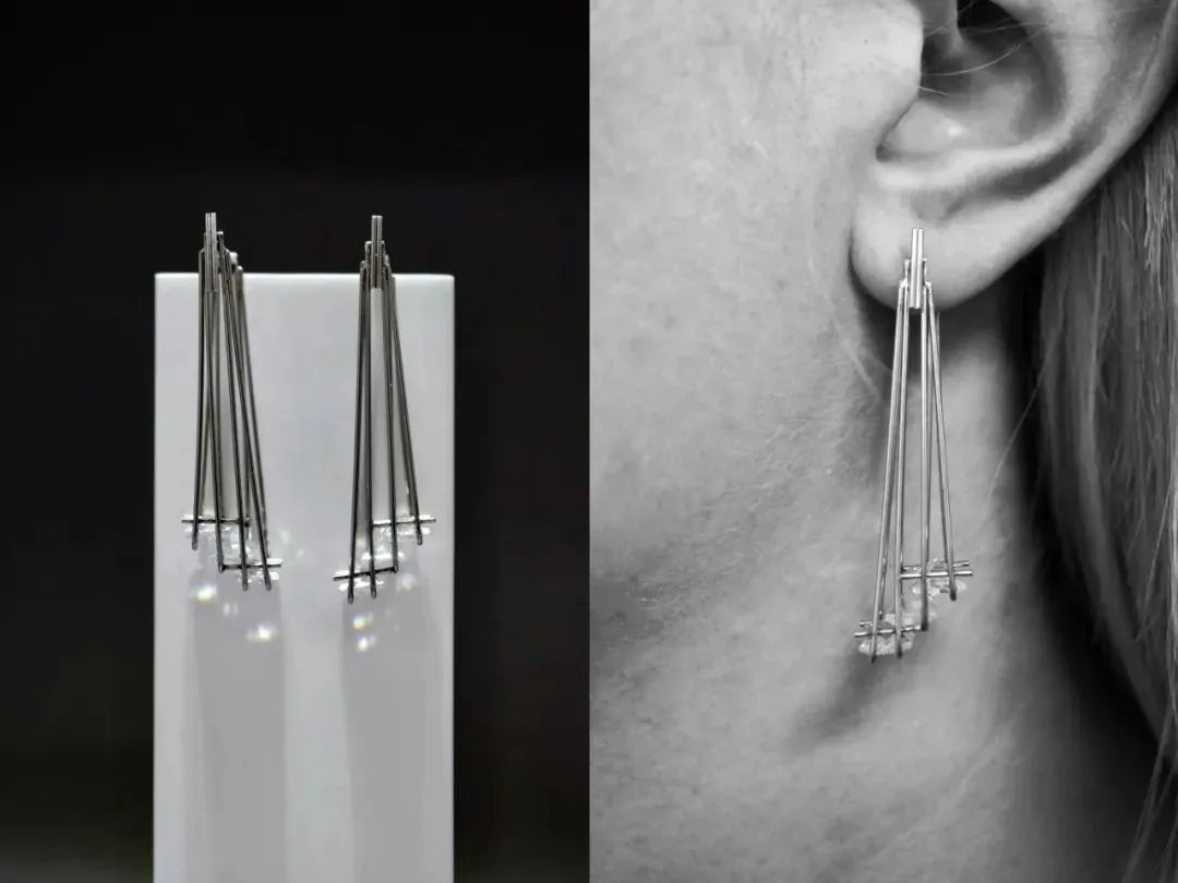 在她的作品集中,洛伊絲融入了類似腳手架、梁和工業結構的元素,以不同的角度鑲嵌石頭。通過利用煙熏石的獨特特性,她實現了類似黎明的漸變效果。長方形石頭的幾何切割增強了它們的光澤,而不銹鋼結構則為佩戴者提供支撐。