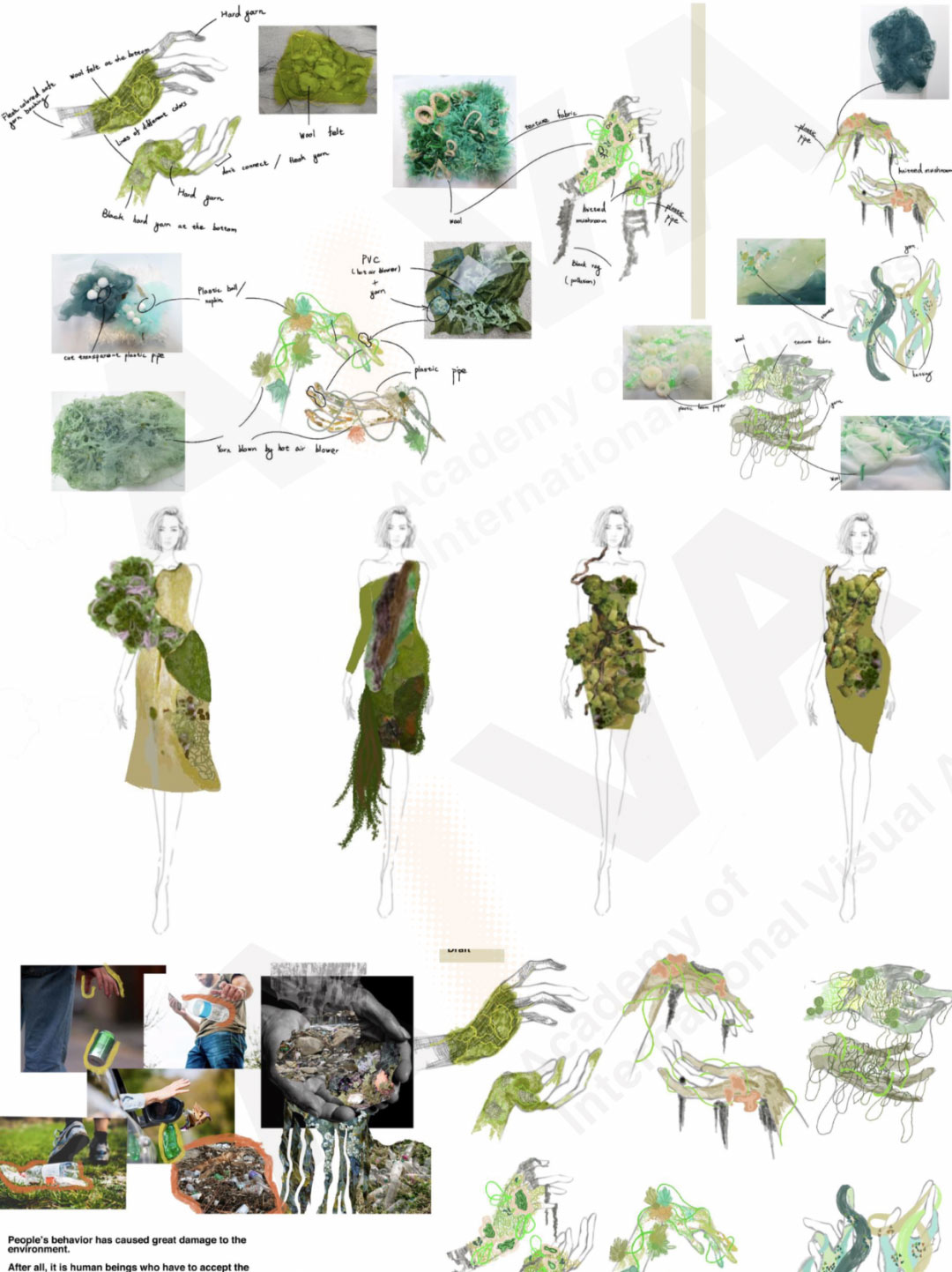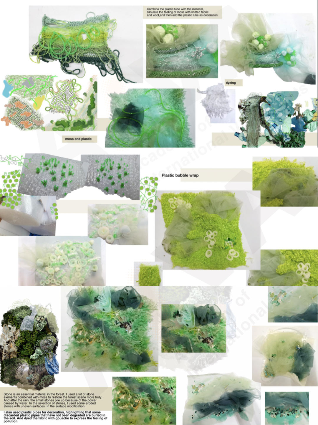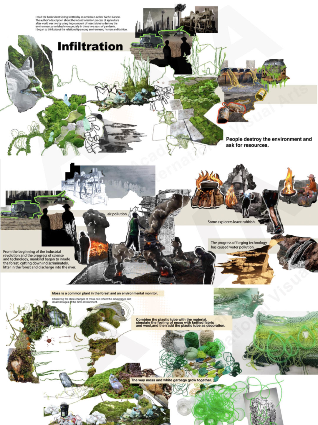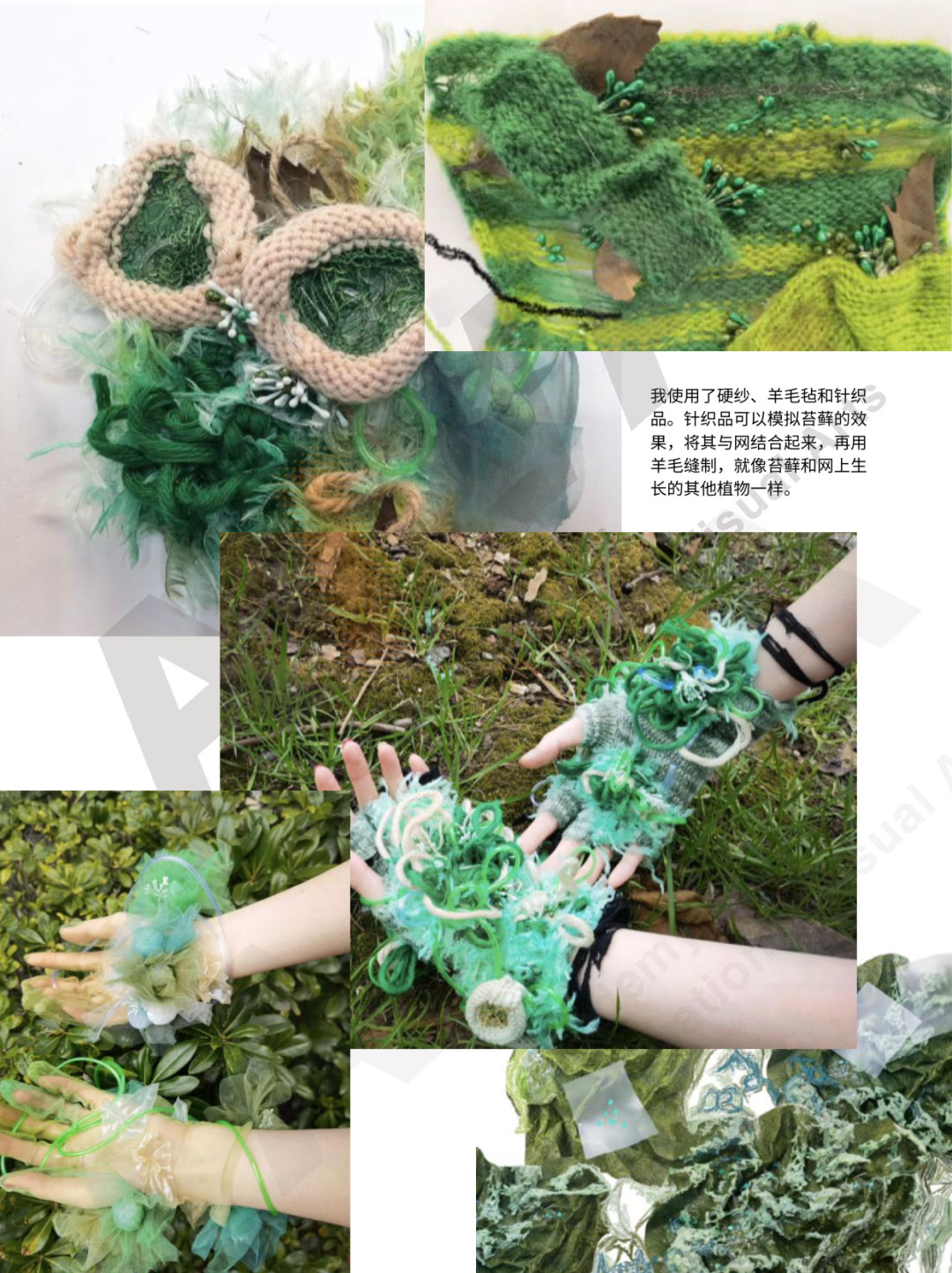“在作品《滲透》中,我以在森林中的塑料污染現象和《寂靜的春天》這本書為靈感進行了面料設計。在這個系列的作品中,我嘗試運用多種非常規材料與傳統面料結合,例如:PVC面料,塑料管,紗,毛線等等,并通過結合多種技術,如針織,滴膠凝固,熱風機融解來體現污染和自然環境互相滲透的主題。最后我設計出了三副手套,以表達所有的污染都是人類親手造成的這一理念,并在自然中拍攝了最后成品的照片和視頻,以表達手和環境無言的對話。”