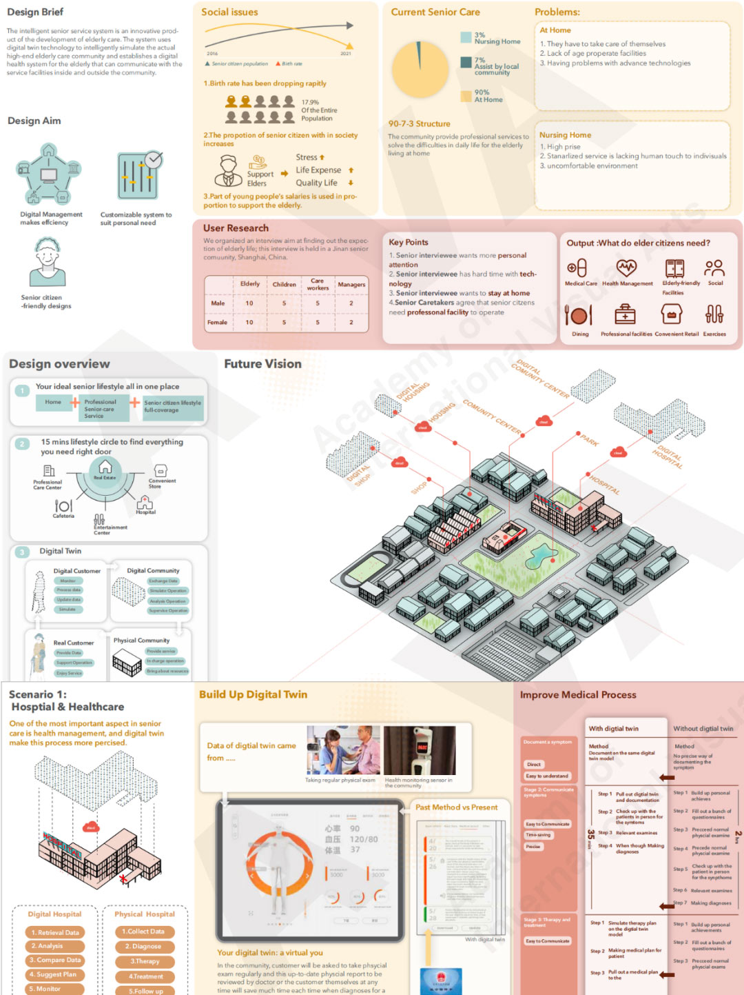 在現代社會,人口老齡化和養老問題持續引發社會關注。在未來,我們的養老服務將會以什么樣的姿態呈現,也是我們不斷在思考的前沿問題。Song同學設計的智能養老服務系統是養老事業發展的創新產物。該系統利用數字孿生模型,智能模擬實際的高端養老社區,建立一個可與社區內外服務設施通信的老年人數字健康系統。