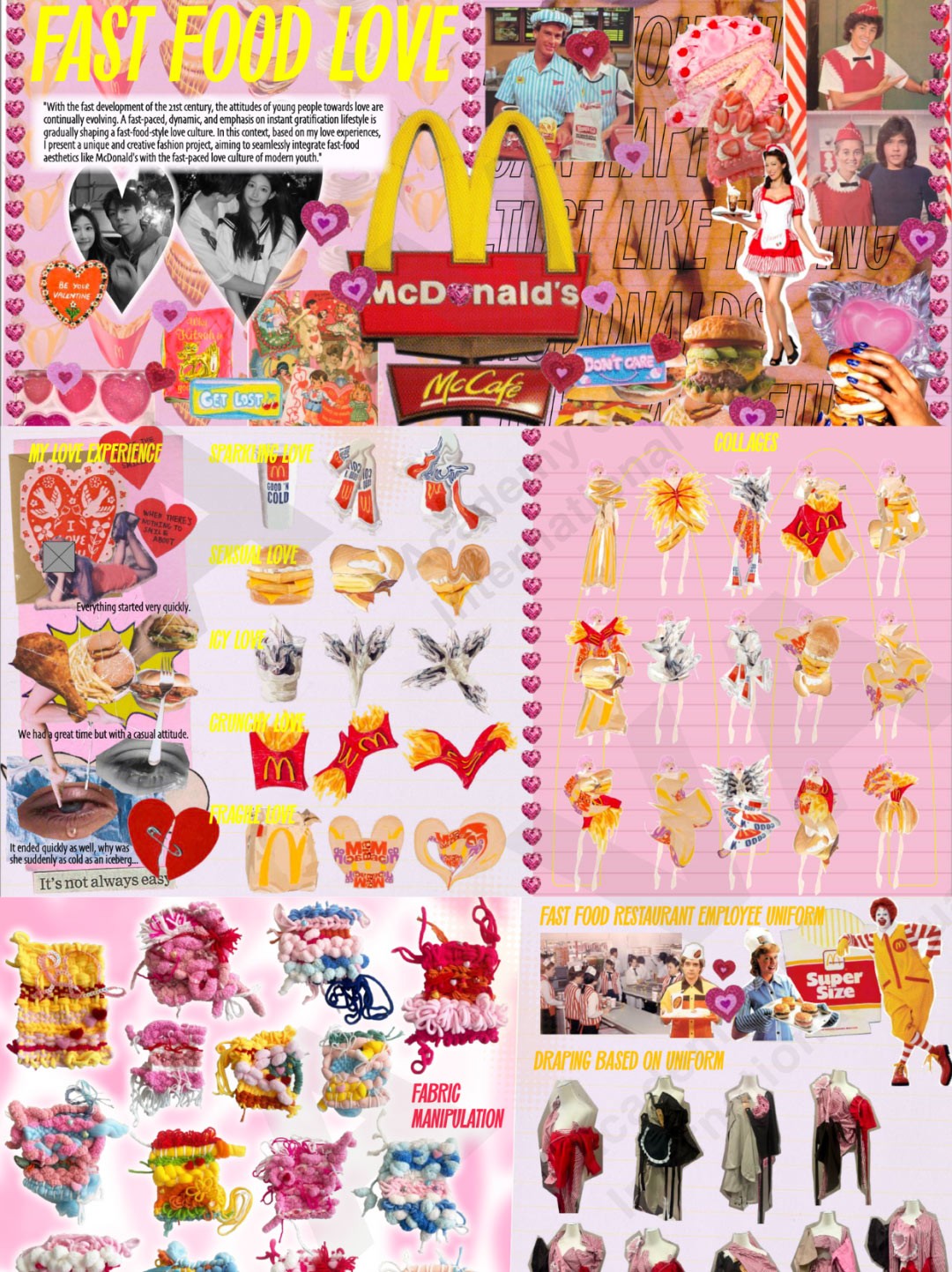 進(jìn)入21世紀(jì),年輕一代的戀愛(ài)觀念也發(fā)生了明顯的變化,一種快節(jié)奏的、充滿活力的、強(qiáng)調(diào)即時(shí)滿足的生活方式正在逐漸形成快餐式的愛(ài)情文化。在這樣的背景下,我基于自己的戀愛(ài)經(jīng)歷,設(shè)計(jì)了一個(gè)獨(dú)特而富有創(chuàng)意的時(shí)尚項(xiàng)目,這個(gè)項(xiàng)目旨在將麥當(dāng)勞等快餐美學(xué)與現(xiàn)代年輕人快節(jié)奏的愛(ài)情文化完美融合。