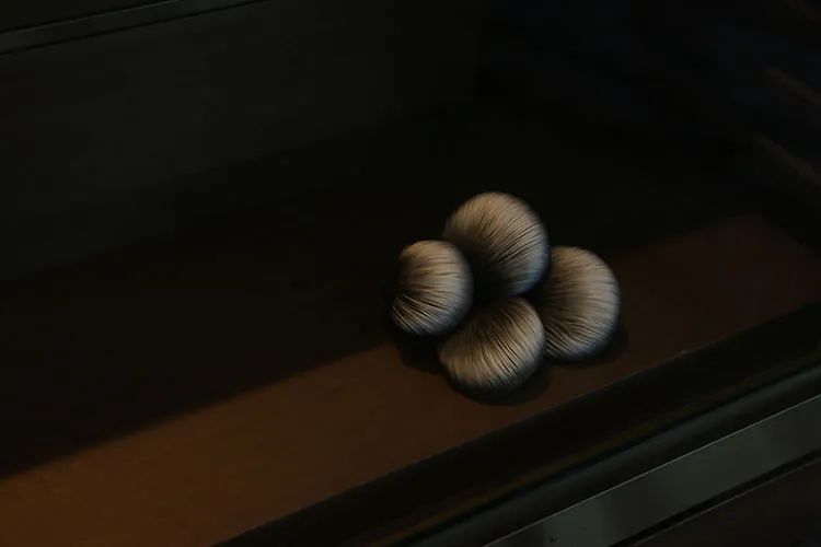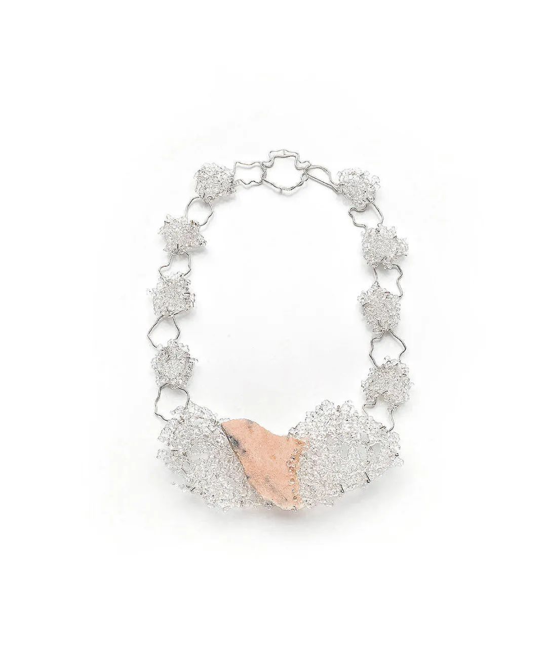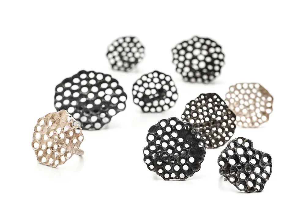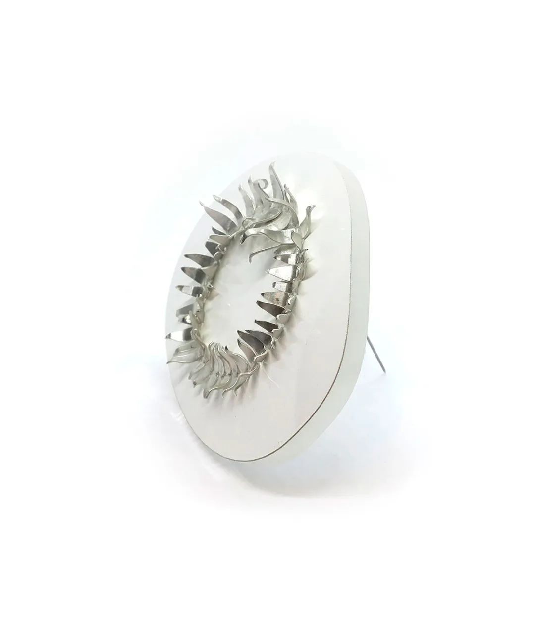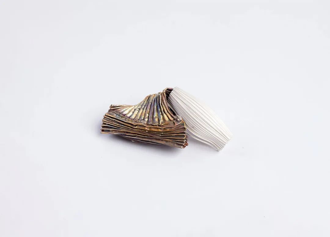 對于Hee-ang來說,蘑菇絕不僅僅是餐桌上的食物。在一次散步中,她偶然發(fā)現(xiàn)一株野生蘑菇,被它獨有的美所觸動,這使她有機會去深入研究這一特別的生物。最初,她嘗試用作品去還原一株完整蘑菇的構(gòu)造,以展示其本身的復(fù)雜細節(jié)。然而隨著時間的推移,她發(fā)現(xiàn)從蘑菇的萌芽到腐爛的整個生長過程,都給她帶來了極大的啟發(fā)。Cluster系列以蘑菇“鰓”為主要設(shè)計元素,想象了蘑菇群是由廣泛分布的地下菌絲體形成的。另一方面,Inside Out系列設(shè)想將蘑菇帽翻過來,露出“鰓”,在內(nèi)部和外部紋理之間形成節(jié)奏對比。Bloom and Wither捕捉了蘑菇生命周期的各個階段,而Slowly則描繪了蘑菇逐漸展開的過程。