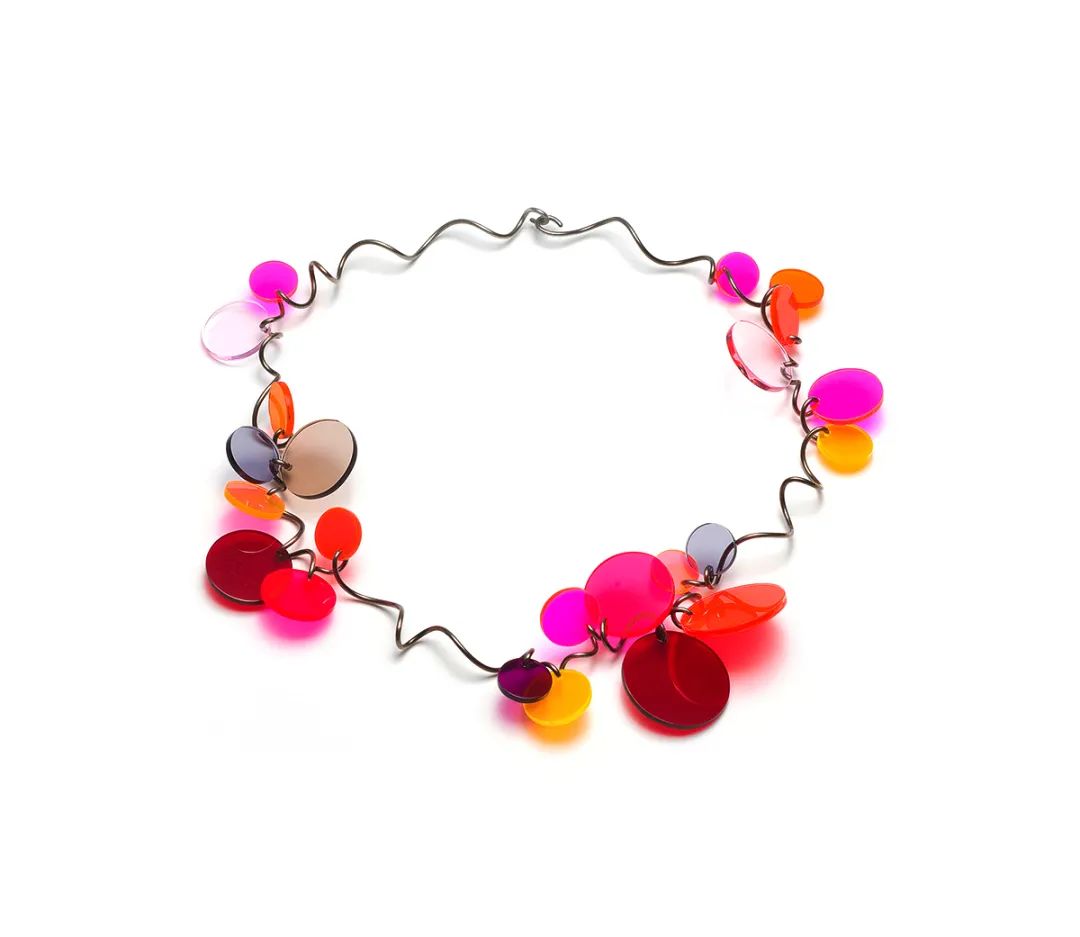 展覽展出了 Jennifer Merchant、Emiko Oye 和 Nikki Couppee 三位藝術(shù)家的作品,他們將塑料變成了可穿戴的藝術(shù)品。塑料無疑是我們?nèi)粘I畹囊徊糠?,也是?jīng)常被忽視的珠寶材料。但這種從普通到壯觀的轉(zhuǎn)變提出了一個(gè)問題:我們?nèi)绾钨x予物品價(jià)值?什么是珍貴的?每位藝術(shù)家都有自己獨(dú)特的方式來解釋這些問題,并通過利用直覺重新改造材料,而顏色仍然是作品的關(guān)鍵組成部分。