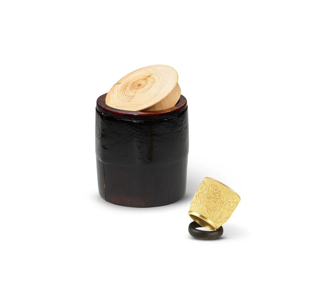 Cast gold from 3D print, horn; Box: laquer on bamboo, boxwood