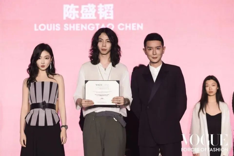 周冬雨與《服飾與美容VOGUE》編輯總監Rocco為陳盛韜頒發“中國新銳時裝設計師大獎”