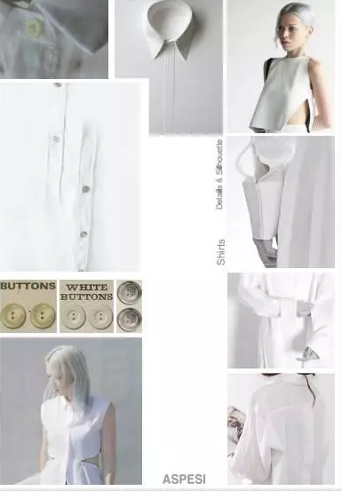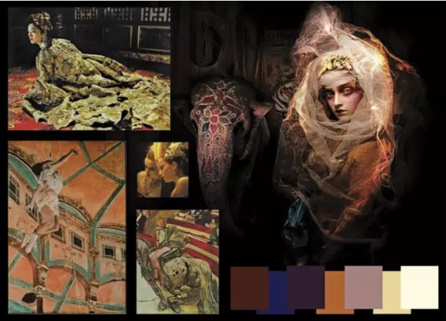 接下來就是設計作品集中不可缺少的moodboard(情緒板),情緒板是在工業產品設計中也經常需要用到的,但是在每個專業中情緒板的作用和包括的內容是截然不同的,在服裝設計中,情緒板可以由inspiration board、color board、material board、detail board等組成。給大家舉的例子就是material board和color board,當然moodboard也可以用一張圖來表現。