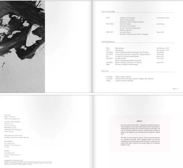 封面過后就是扉頁,很多學生選擇在這里列出自己的作品集項目或是簡歷都是可以的,可以是設計師對自己進行了一個介紹,或是羅列一下自己的教育經歷和工作經驗等。