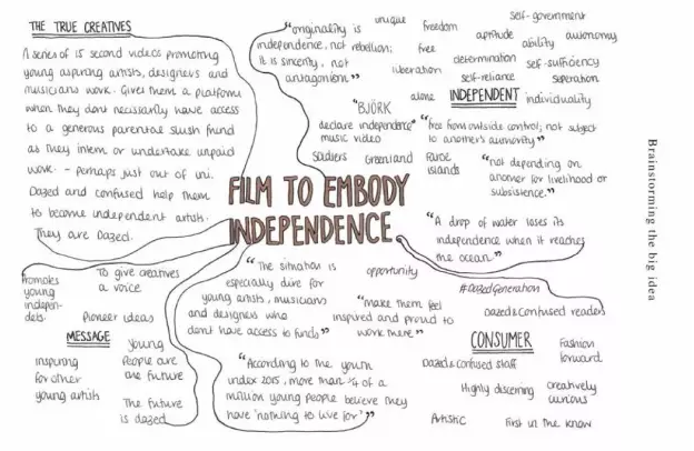 此外Research中還應該加入brainstorming、mind-map等思考環節。那么什么是mind-map呢?就是圍繞著中心論點展開蜘蛛網般的發散觀點,所有的小觀點和主論點是有一定聯系的。
