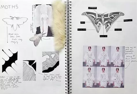 下面這個案例相對上圖,Research從服裝結構上加上靈感點(蝴蝶)。這個案例中可以看到學生運用文字和sketch結合的方式,來說明自己的研究過程。