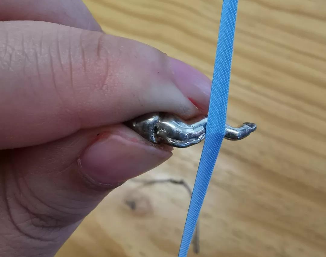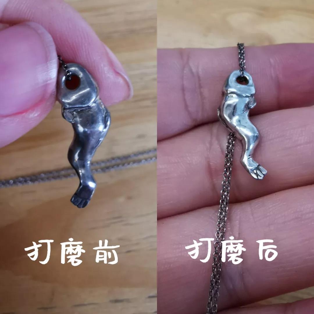 下面以曉辰老師的小魚干吊墜為例進行效果演示,因為長時間放置加上上海的強大濕力,小魚干吊墜表面已經(jīng)氧化暗淡了,拋光帶可以貼合小魚干表面的角度進行打磨,如果拋光物件有孔洞造型,也可以像做鏤空切割時一樣將拋光帶穿過空洞進行拋光。
