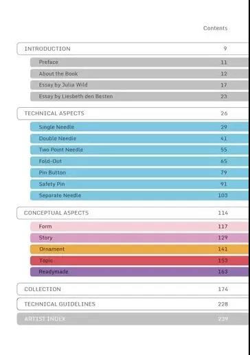 X:現在能買到的應該是圖上這款改版后的樣子。從封面上就能看到不同的藍色線框圖形和色塊,每一個圖形和色塊其實都分別代表了從形式和內容定義上被區分出來的不同背針類型。給大家看一下目錄,按照封面的顏色標記出了每一種類型的名稱,方便讀者快速的翻頁查找。在每一個章節的扉頁上也會對該類別的背針進行詳細的定義,幫助大家理解這個分類的具體指向和范疇。