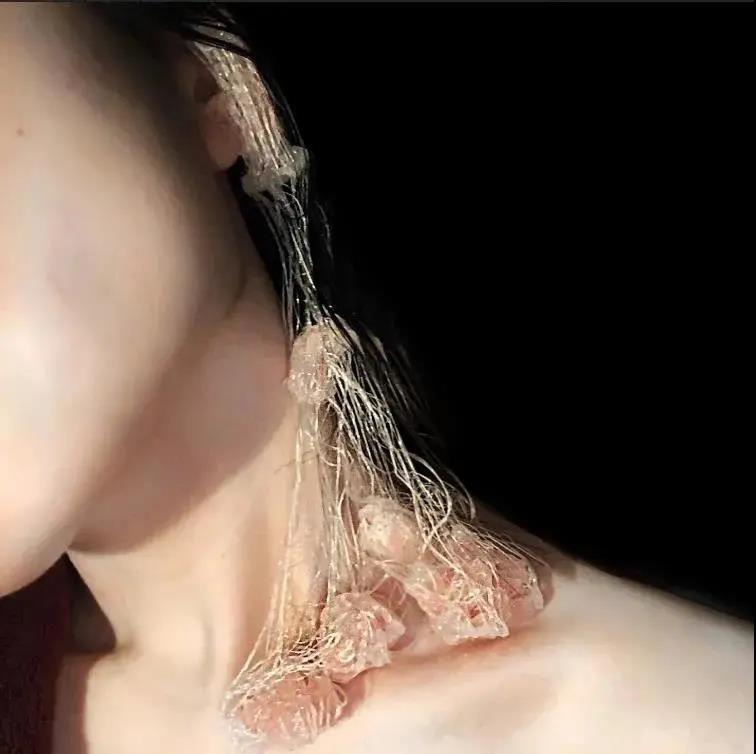 I like to think of myself as an object in the tunnel of time, and then I can feel the passage of time with my whole body. I use spider webs as the main visual language of my work, and use silicone that resembles skin texture and color as the nodes, and is wrapped together by spider webs. And wear it in the corner of the body, the purpose is to create an atmosphere of time is the protagonist, space is a supporting role, and people are just an object that will fall ash, will grow spider webs, let the audience focus on the passage of time.