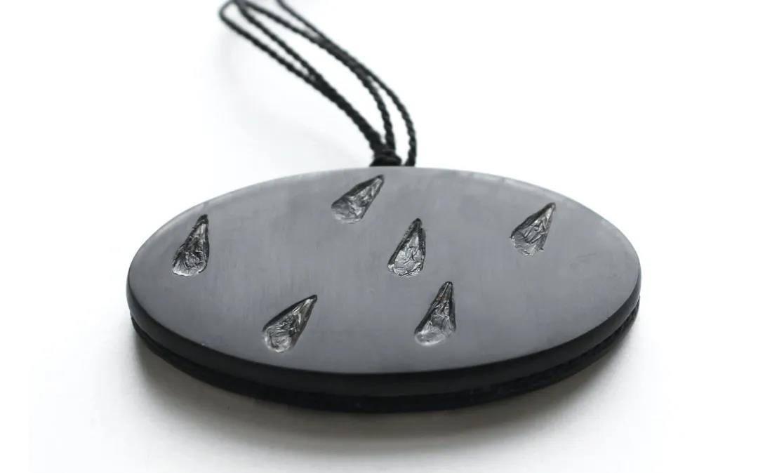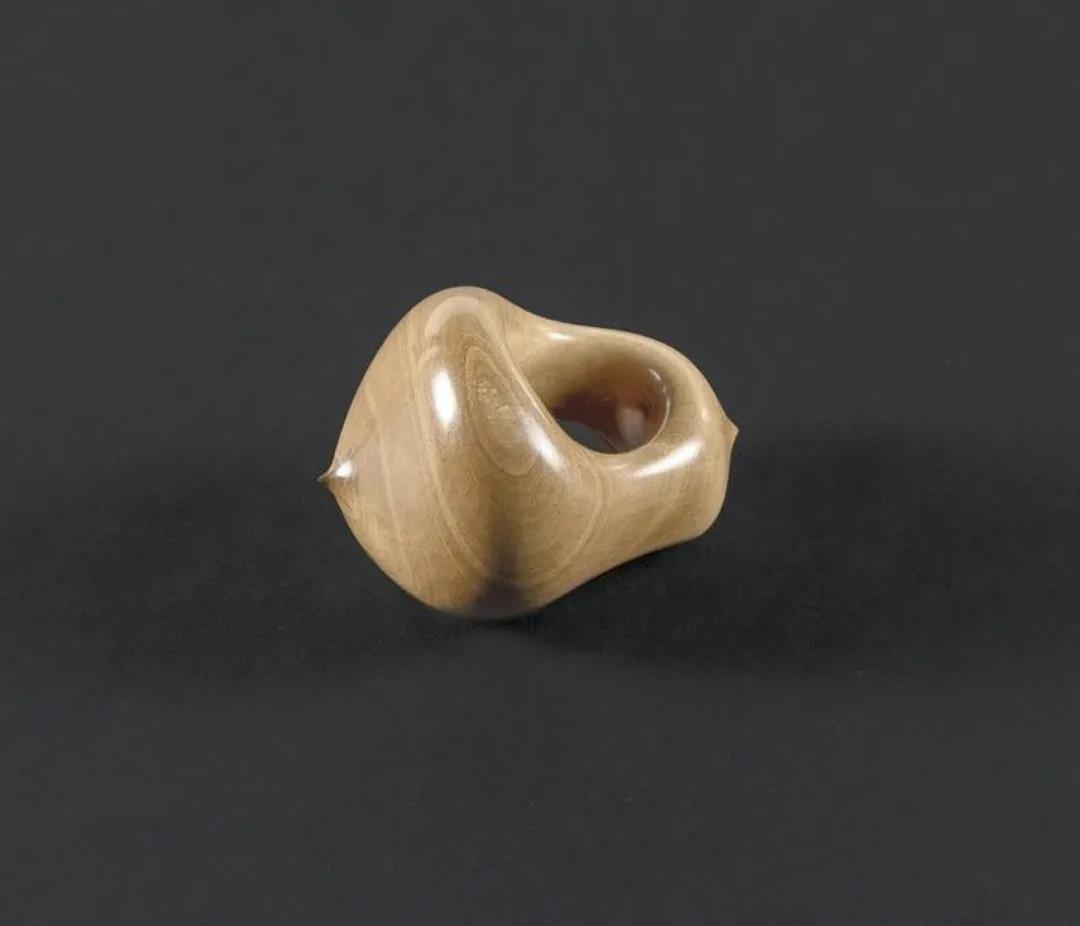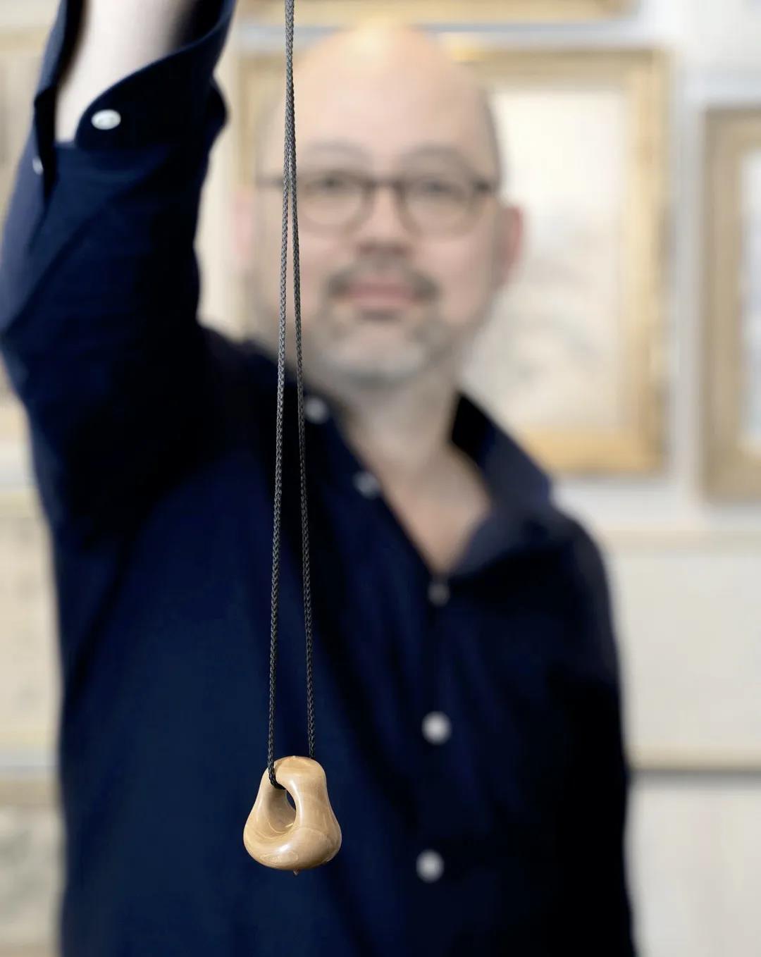 這個形似童話故事中蘑菇屋的環形掛墜,是由藝術家Yutaka Mineghisi選用有著一萬年歷史的猛犸象牙化石雕刻而成。它的外表十分光滑,但也要小心 - 它隨時可能劃傷您。