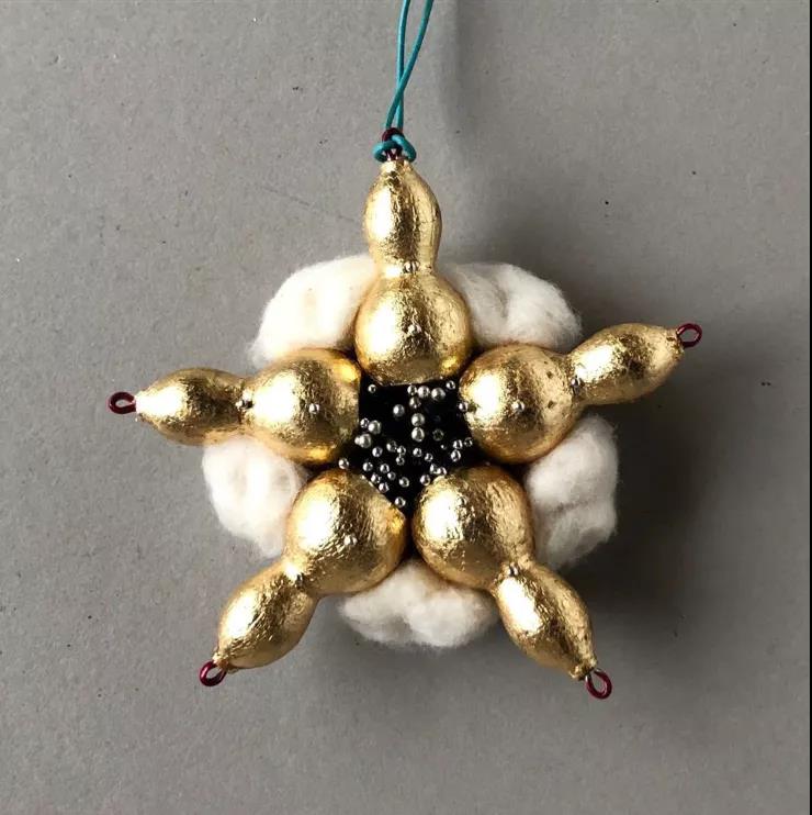 Wooden gourds, gold leaf, aluminum coffee filter,silver, glass beads, cotton, paint, leather cord