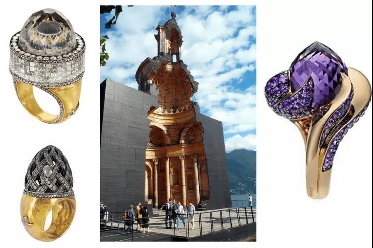 圖左:Sevan Bicakci的戒指。圖右:Rodney Rayner的紫水晶戒。圖中令人贊嘆的建筑是位于瑞士南部盧加諾的San Carlo教堂。