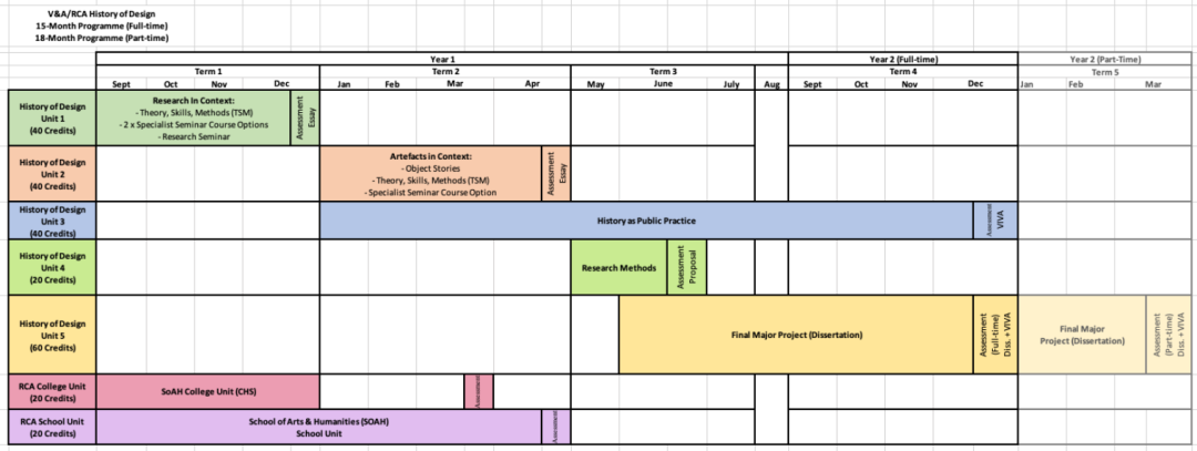 V&A / RCA設計史MA課程由該項目提供的上述單元(200學分),加上藝術與人文學科單元(20學分)和學院單元(20學分)組成。課堂形式包含研討會、工作坊、講座、一對一指導、系列研究討論會及實地參觀。