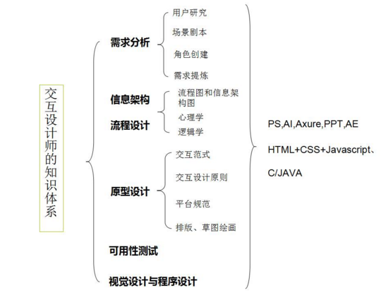以上這張圖是交互設計師的知識體系,涉及到的內容特別多,本文主要想給大家解釋的是UX和UI的關系,以后再詳細給大家介紹交互設計的其他方面。