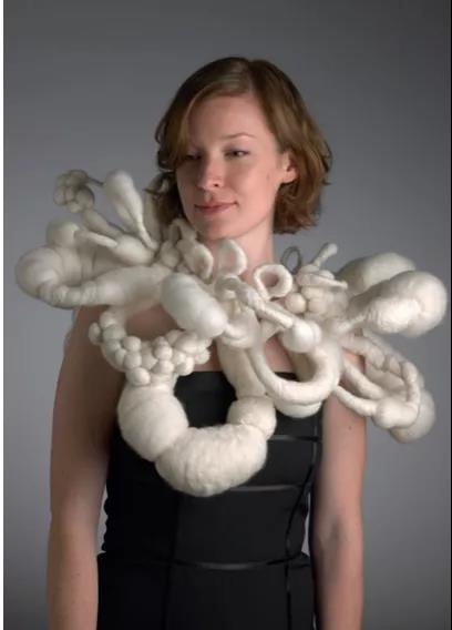 Takei還發現羊毛很適合用來制造首飾而不僅僅是裝飾品。她說:“我對首飾的想法很感興趣,我認為首飾不僅僅是裝飾。“在首飾制作中非傳統材料的規模和使用的轉變使我能夠挑戰這些想法。” 為了做到這一點,Takei使用紋理,顏色和構圖,創造軟和感官曲線,這是金屬所很難能實現的。像她驚人的超大體量項鏈,她所做的不僅僅是抓住觀眾的眼睛;她創造了一種渴望伸出和觸摸作品。