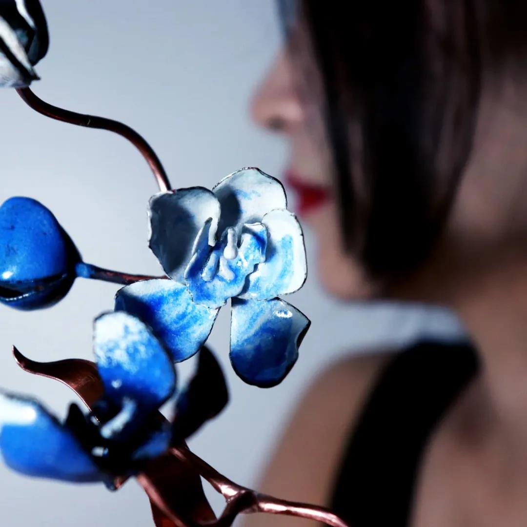 其次因為作品比較大,而學校的琺瑯爐比較小,每次只能單獨燒制一朵蘭花,所以將蘭花連接到主枝干上是一個很大的問題。我先后嘗試了鉚接和激光焊接,但它們都不能完好無損地連接在一起。我詢問了很多人的意見,并做了很多嘗試,最終找到了解決辦法。雖然過程十分艱辛,但是結果是好的。
