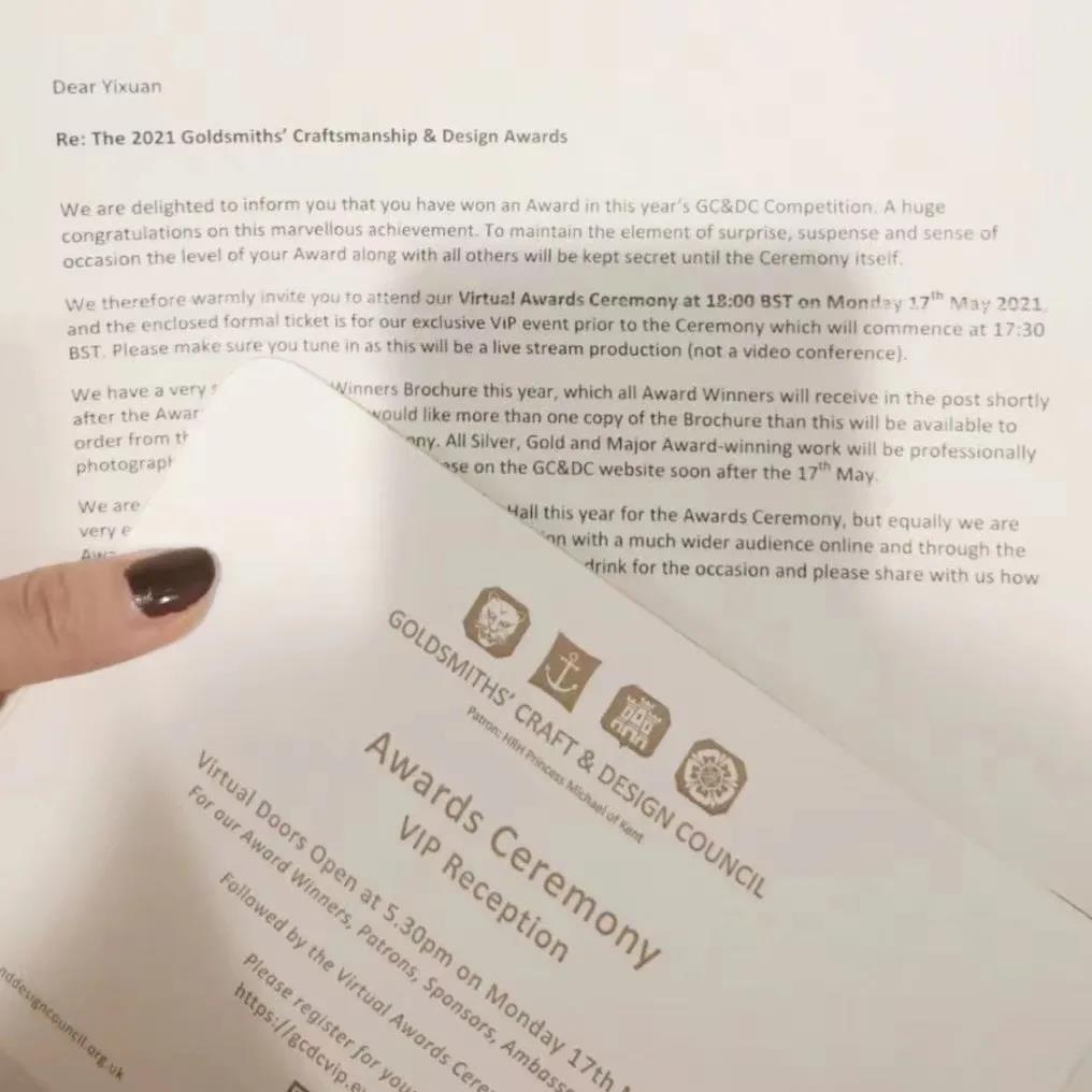 上周,我們收到了來自AIVA19屆畢業生Yixuan的好消息,她的首飾作品斬獲了2021英國金匠精工藝與設計大賽大獎,這個重量級獎項一直被譽為“珠寶界奧斯卡”!