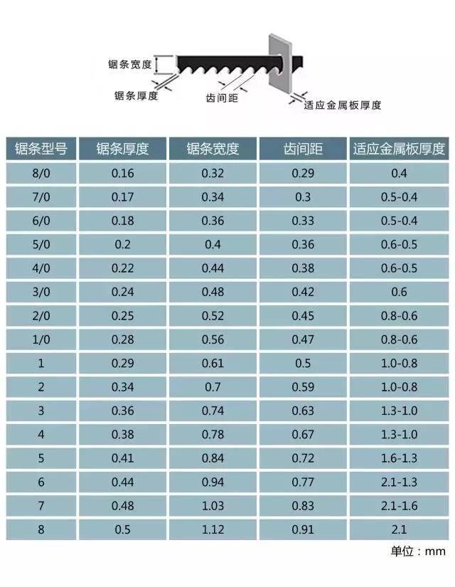 線鋸也就是我們通常講的鋸條,而我們常用的鋸條根據厚度和鋸齒的間距可以分成16種型號,從最細的8/0、7/0……一直到最粗的8。就像數據上顯示的,它們之間的尺寸差異其實非常小,但是大家要知道,首飾本身的體量也不大,在金工制作中,0.1毫米也不是一個小的距離。