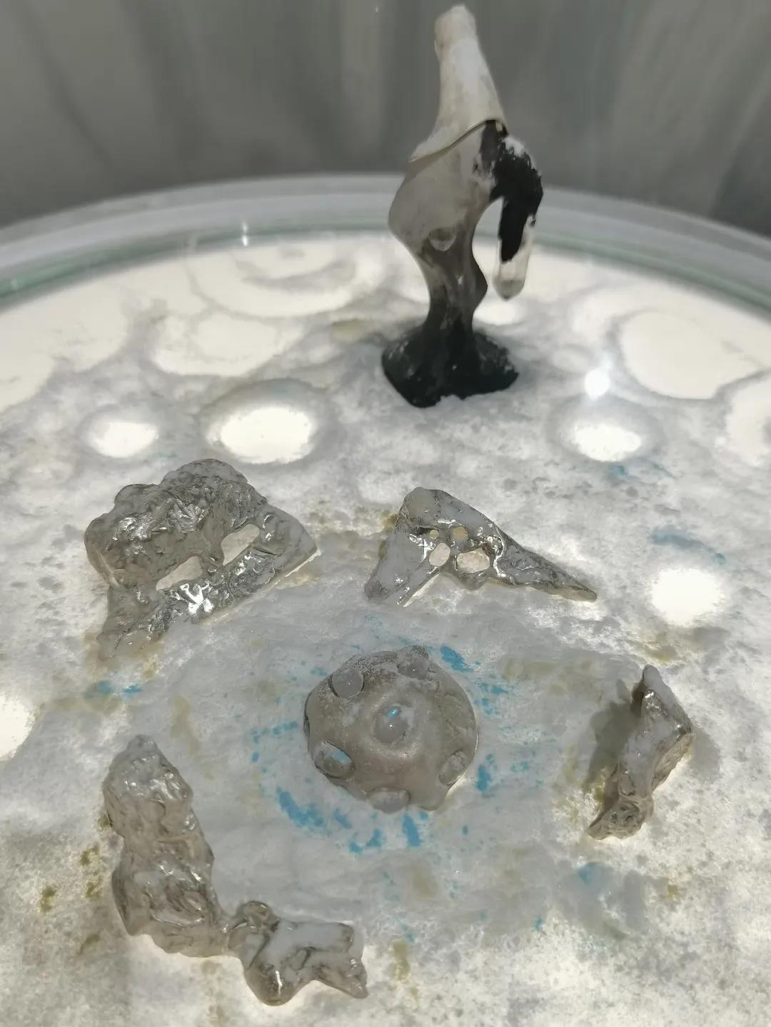 本屆畢業(yè)展的作品豐富多彩,大多作品以綜合材料為主。一個月前常見陳家炫師弟在工作室忙碌的趕制畢業(yè)作品,他的作品《侵蝕》設(shè)計的靈感源于對珊瑚礁石的聯(lián)想。身處濱海城市大連,經(jīng)常可以看到岸邊的礁石被一個又一個巨浪打擊,一次又一次地遭到侵蝕,潮起潮落,奔流不息。在歲月的洗禮下,變得粗糙,渾身上下滿都是縱橫交錯的傷痕。由此便產(chǎn)生了他的創(chuàng)作靈感。通過對珊瑚形態(tài)的變形和抽象化的處理,表現(xiàn)珊瑚礁石被歲月侵蝕的痕跡。也愿各位即將畢業(yè)的同學(xué)即使經(jīng)過歲月的洗禮后,仍有“千磨萬擊還堅勁,任爾東西南北”之心。