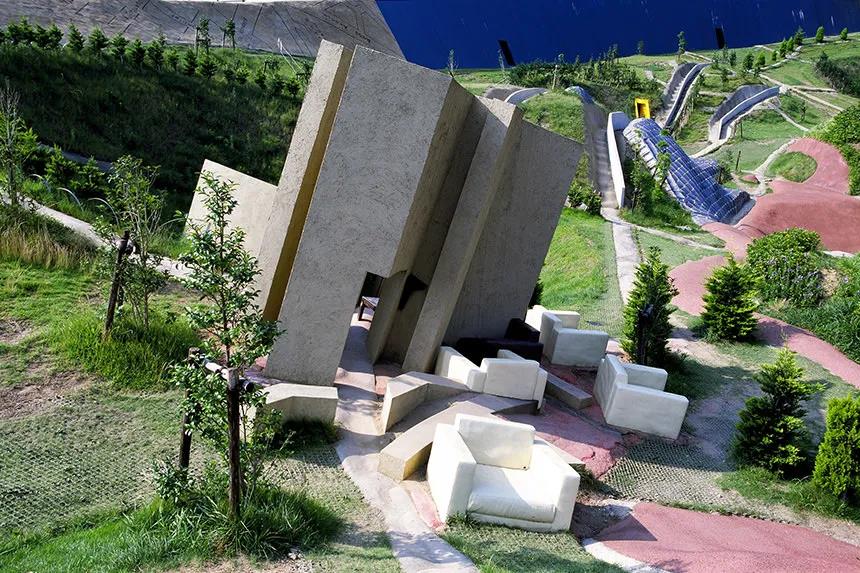 整個空間約有18100平方公尺,沒有山澗、沒有湖泊、更沒有路牌指引。只有起伏不平的地面、視覺錯覺效果的裝置作品、不規則的建筑物、迷宮、險坡和森林。