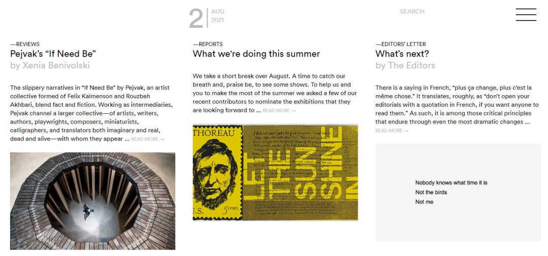因此,無論你關(guān)注的是藝術(shù)教育、圖像傳達(dá)、人工智能、非洲悲觀主義、宇宙主義等等任何話題,都可以在e-flux獲得更多靈感和新思路。
