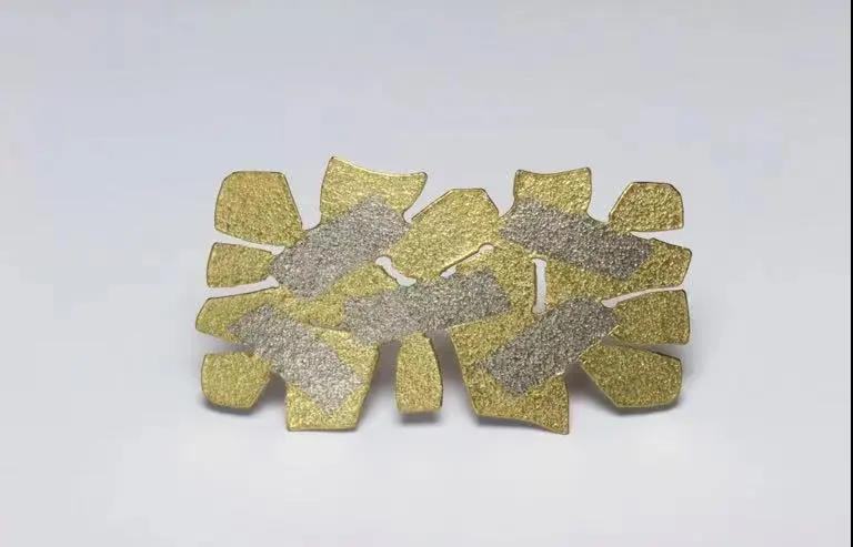 “我也對內、外平面之間對話的潛力感興趣,在嚴格劃定的邊緣內,隨機圖案處于緊張狀態,以及所有這些因素的對比與和諧所創造的視覺動態。從技術上講,我一直在嘗試擴大黃金和鉑金融合的可能性,使用鉑金紗布、網眼布、破損碎片、鑲嵌物、金屬絲和金粉來創造各種表面,從中我構建了我的珠寶。在制作之前,我很少畫一幅作品,我更喜歡直接在金屬中創作,這樣我就可以敞開心扉,接受各種可能性,避免在完成一幅作品之前固定任何細節。”