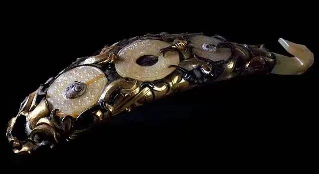 我國早期的鑲嵌工藝在玉帶鉤這種美輪美奐的工藝品上得以呈現。玉帶鉤起源于西周末年,到了春秋戰國時期,由于當時制作工藝的提高和金、銀、鐵等金屬的廣泛使用,開始出現一些利用鑲嵌工藝制成的帶鉤,這種帶鉤一般都是在銀、銅、鐵上鎏金嵌玉。