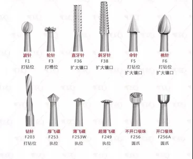 牙針——機用為主,分平頭與尖頭兩類。主要用于將一些凹凸不平的部位掃順,使得被清理的部位線條清晰。也經常使用開夾層、穿孔等。也可以用于清潔包鑲位置的邊邊角角。