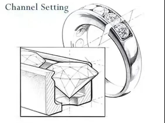 軌道鑲嵌也是鉆戒鑲嵌樣式中的經典方式,又稱為逼鑲、迫鑲、夾鑲或是槽鑲。軌道鑲嵌可以和抓鑲結合,將單顆鉆石鑲嵌起來,也可以將一顆顆連續鑲嵌在金屬軌道中,利用在金屬托架上車出的溝槽兩邊金屬張力來穩定鉆石的,凸顯鉆石的光芒。