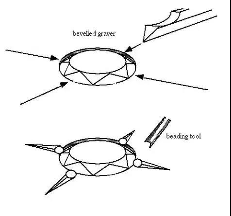 起釘鑲是指使用鋼針磨成的小鏟鏟起金屬片,經過進一步鏟撥形成聚攏的金屬小丘,吸珠后成為頂部圓亮的小釘,再通過對小釘的擠壓而固定寶石的方法。