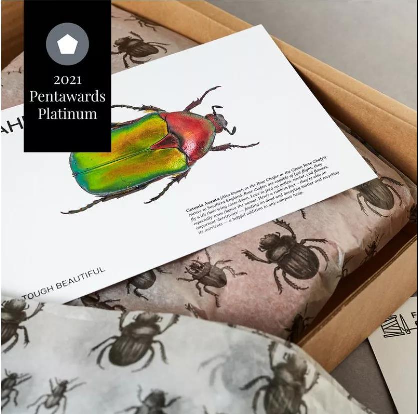 Supple Studio為英國小型家族夾克企業FRAHM設計的環保包裝——采用英國本土甲蟲的微距照片,將大自然堅韌而美麗的小動物作為主角。