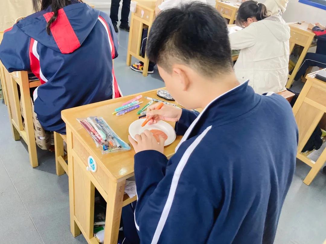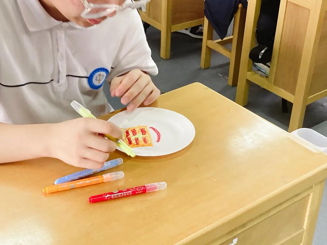 同學(xué)們認(rèn)真進(jìn)行著創(chuàng)作,并且加入自己的創(chuàng)意。一位同學(xué)將早飯吃的漢堡畫在餐盤上,并撕掉一塊,就像是被咬掉的一口,獨(dú)具想法~