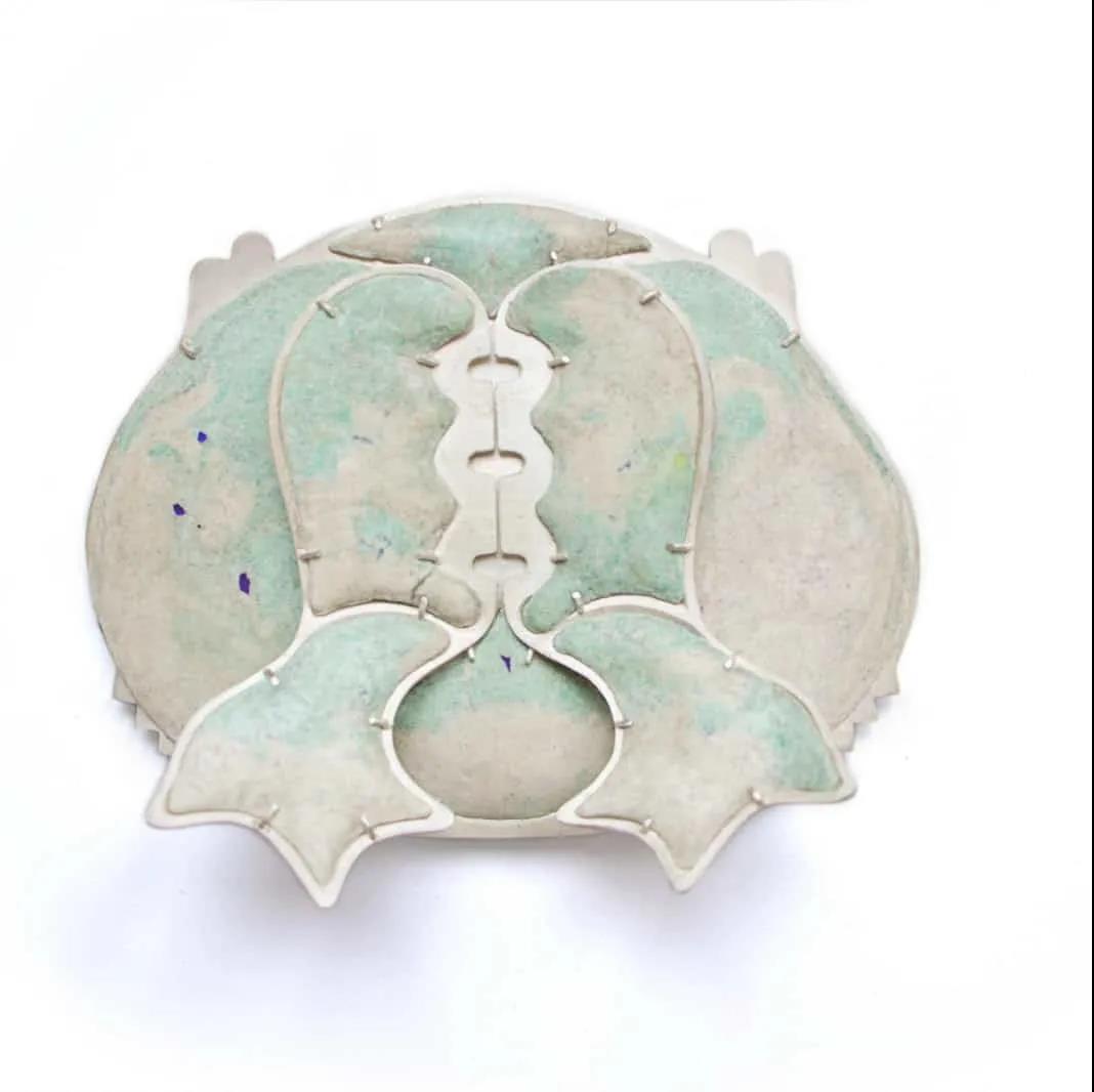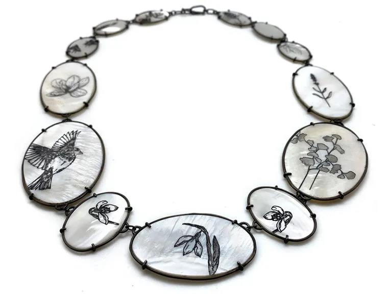 Shinji Nakaba 是一位當代日本首飾人,他用礦物、貝殼、珍珠和鋼鐵以及回收的鋁罐和塑料瓶呈現自然主義但隱晦的圖像。Nakaba使用古老的工藝雕刻寶石、貝殼和珍珠。但是他的項鏈、胸針和戒指看起來一點也不傳統,盡管逼真的圖像被渲染得非常精確。面部以陡峭的角度出現,與其他面孔或人物緊張地接觸;單獨的女性乳房或男性生殖器位于前面和中央;珍珠變成了令人毛骨悚然的頭骨或無形的頭顱。