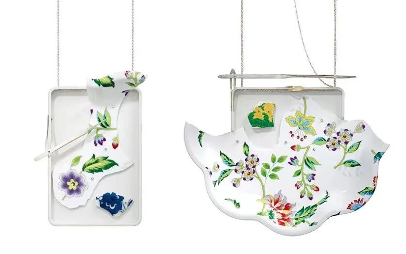 在上面這件作品中,Deganit Stern Schocken把粉彩瓷片與時針結合起來,意圖表現舊瓷片的歷史感和時間感。她的這兩件吊墜作品表明了一種無所顧忌的混搭的可能性,具有強烈的脂粉氣和女性意味。她把本應被丟棄的破碎之物置入了一種全新的語境中,在這個新的語境里,碎瓷片既可以被看作為一個容器的基座,又可以變為一件與身體親密接觸的首飾。