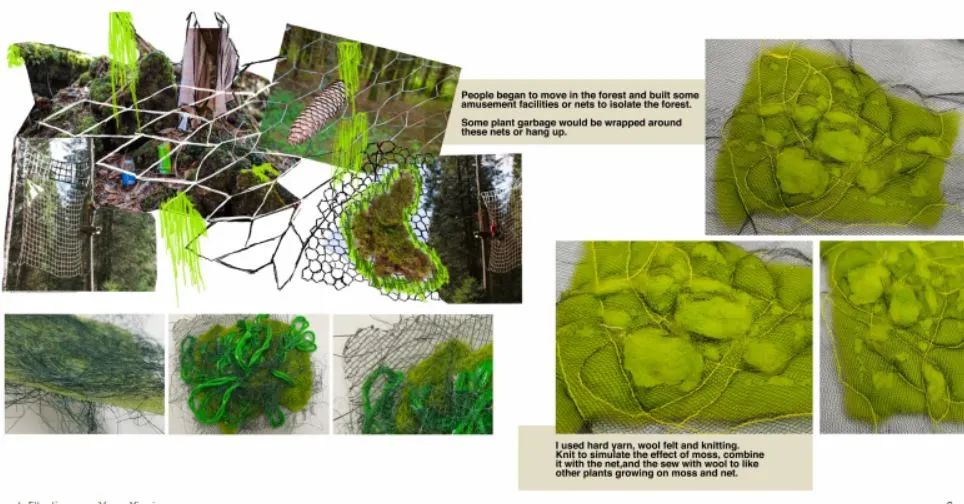 我用塑料材質(塑料管、泡泡紙)、金素材質和網狀材料來代表污染物,給他們染色,用一些毛線、碎布、紗線、毛氈來表現植物的質感,將這兩種反差很大的材質通過編織、縫線等等的方式結合到一起,來體現我的主題,污染和自然環境互相滲透。