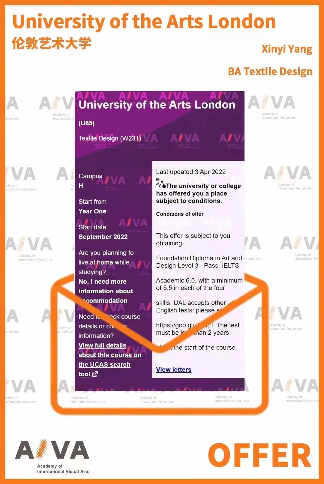上周四,AIVA本科預科服裝專業學生Xinyi參加了UAL線上面試,順利拿到了切爾西王牌專業——紡織設計的offer,讓AIVA所有老師都倍感激動!而更多的offer還在飛來中~