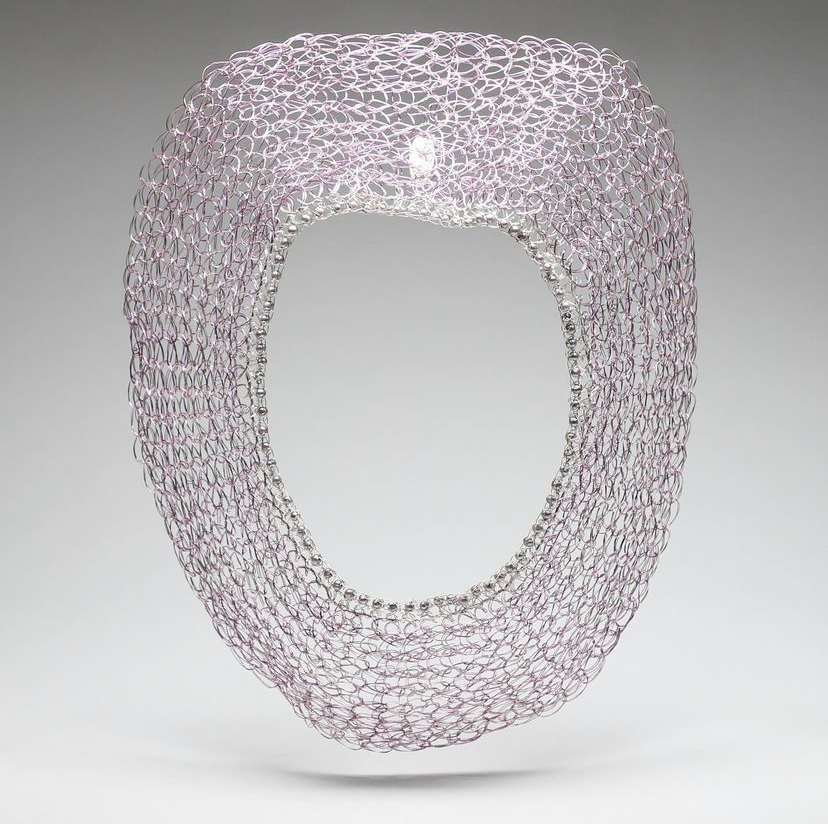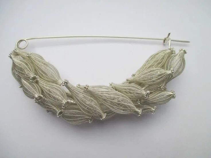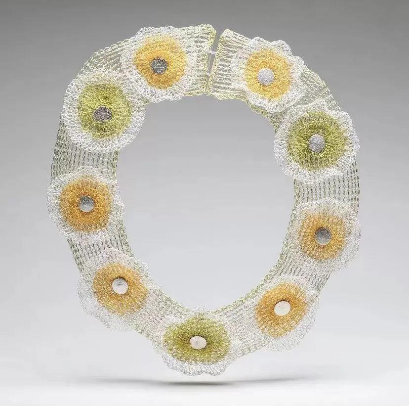 紐約藝術(shù)家Arline Fisch在振興珠寶作為一種當(dāng)代藝術(shù)形式方面發(fā)揮了核心作用。她的杰出貢獻(xiàn)是將編織技術(shù)引入珠寶制作領(lǐng)域。她使用扁平的金銀線、編織、編結(jié),運(yùn)用靈活的編織手法、致密反光的圖案、微妙的質(zhì)感和鮮艷的色彩將編織和鉤針編織的輕巧和靈動(dòng)展現(xiàn)地淋漓盡致。