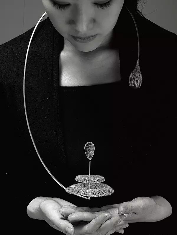 “我希望能讓人們感受到編織這種技術(shù)的多種可能性:我可以在它當(dāng)中鑲?cè)雽毷部梢园阉鳛榛ńz的裝飾,另外也可以讓它成為單獨(dú)的首飾作品。當(dāng)然,有些作品也可以引發(fā)關(guān)于佩戴性的討論。”