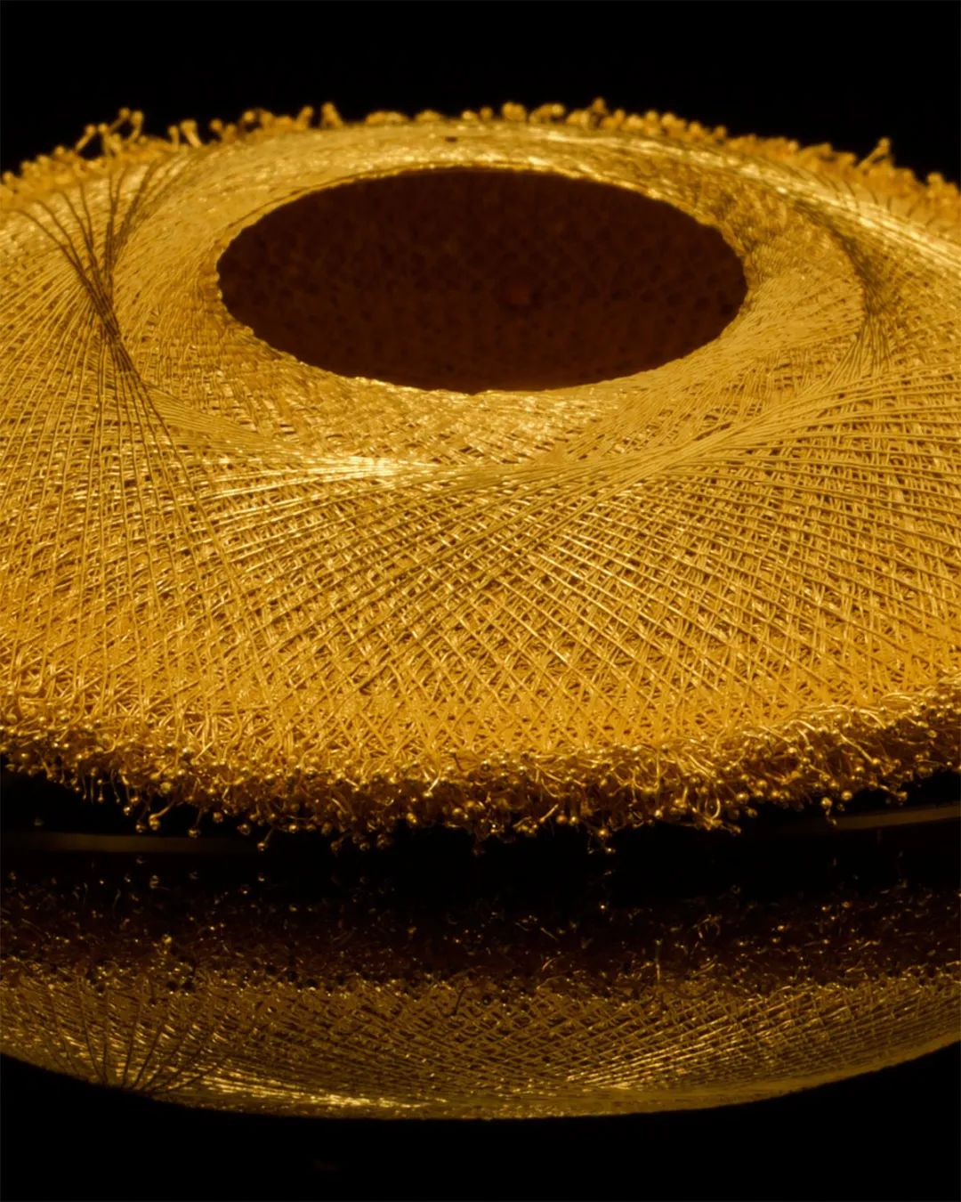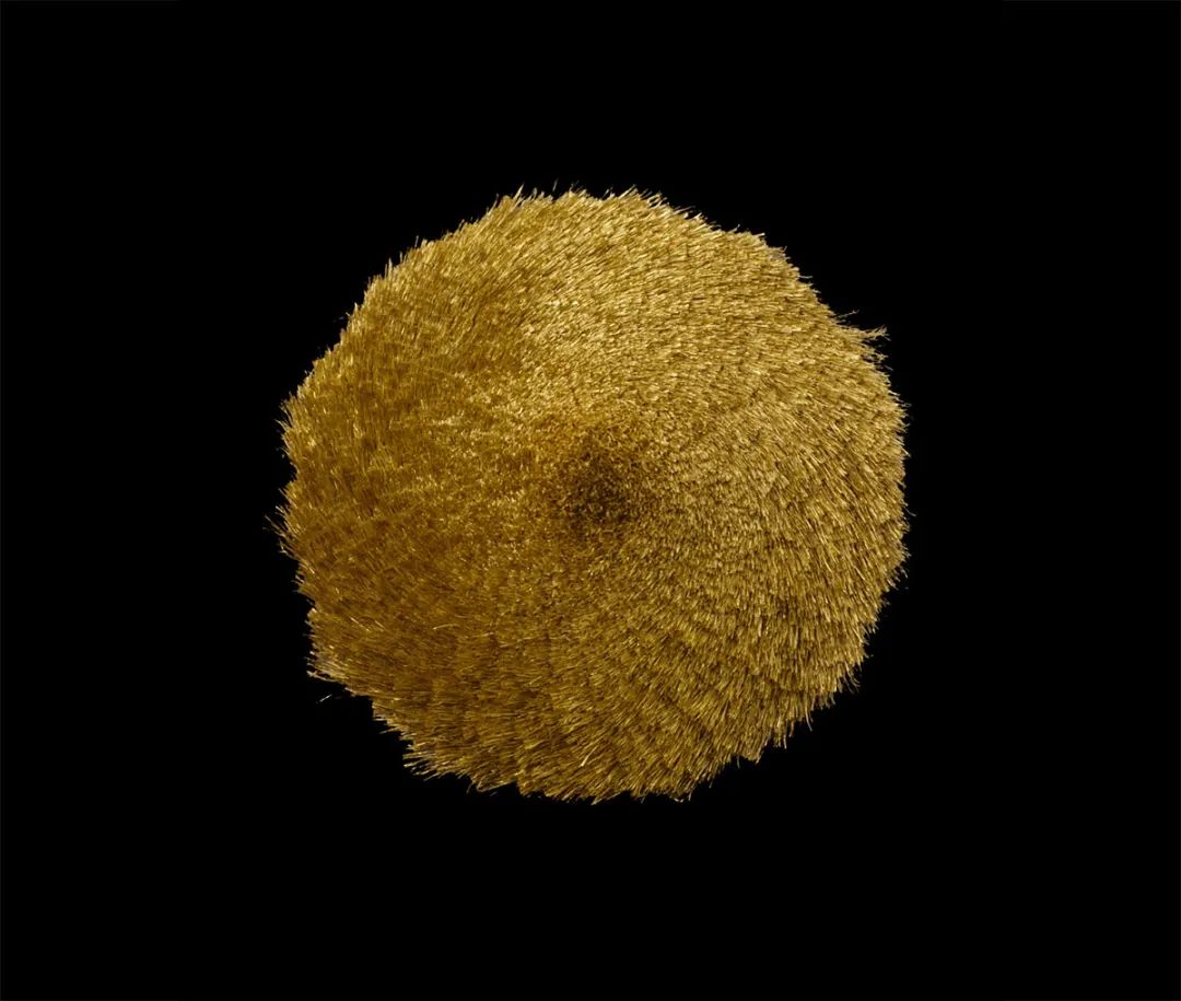 藝術(shù)、形式和技術(shù)研究一直是 Corvaja 的生活哲學(xué),對他來說,探索黃金及其潛力是一項真正的使命。在 90 年代初,這位藝術(shù)家開發(fā)了一種系統(tǒng),使他能夠?qū)ⅫS金和鉑金拉細(xì)至人類頭發(fā)五分之一的粗細(xì),制成的纖維觸感非常柔軟。這種技術(shù)的發(fā)展加上他對煉金術(shù)的研究,使他將金羊毛作為魔法石的隱喻,引發(fā)了他真正追求金羊毛的愿望。