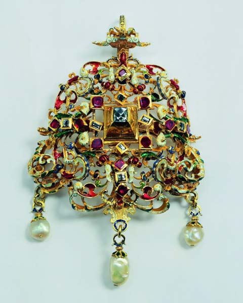 這件造型結構非常復雜的吊墜,以那一時期常見的卷曲的植物枝干效果為造型,使用彩色寶石與彩色琺瑯來達到創作上的和諧。該吊墜的制作時期雖然為藝術史上的風格主義時期,但是首飾的制作風格變化遠不如繪畫或者雕塑來的迅捷,因此在這件吊墜上我們依然可以感受到文藝復興時期對于和諧之美的追求。從穩定且對稱的基礎造型,寶石與琺瑯交錯創造的濃烈色彩對比,中性圍繞式的布局構建,無不展示了當時工匠精湛能力。部分也歸功于當時已經形成了具有學校制度與體系的專業的手工藝培訓工作室。