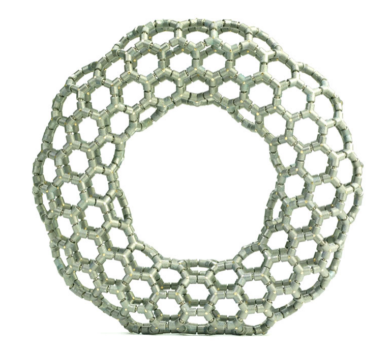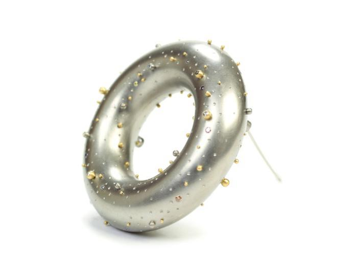 作品整體以完美的幾何形態(tài)呈現(xiàn),弧面金屬的光澤創(chuàng)造出一種透明空間的錯(cuò)覺(jué),表面點(diǎn)綴的金銀粒與寶石則象征著遠(yuǎn)處的星塵。這種像甜甜圈一樣的造型吻合近年來(lái)科學(xué)家們對(duì)宇宙形狀的推測(cè)(這個(gè)形狀在?sa Christensson的作品中也多次出現(xiàn)。)
