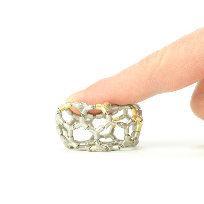 正如前篇所提及的,航天、天文領(lǐng)域的科技發(fā)展為首飾設(shè)計(jì)帶來(lái)了新的可能性,材料運(yùn)用的突破也正是當(dāng)代首飾重要的研究方向之一。我們可以找到許多藝術(shù)家嘗試將航天工業(yè)相關(guān)的材料制作成首飾,或是借用高科技的設(shè)備作為設(shè)計(jì)原型,試圖為首飾帶來(lái)更加豐富的表現(xiàn)力與佩戴感受。