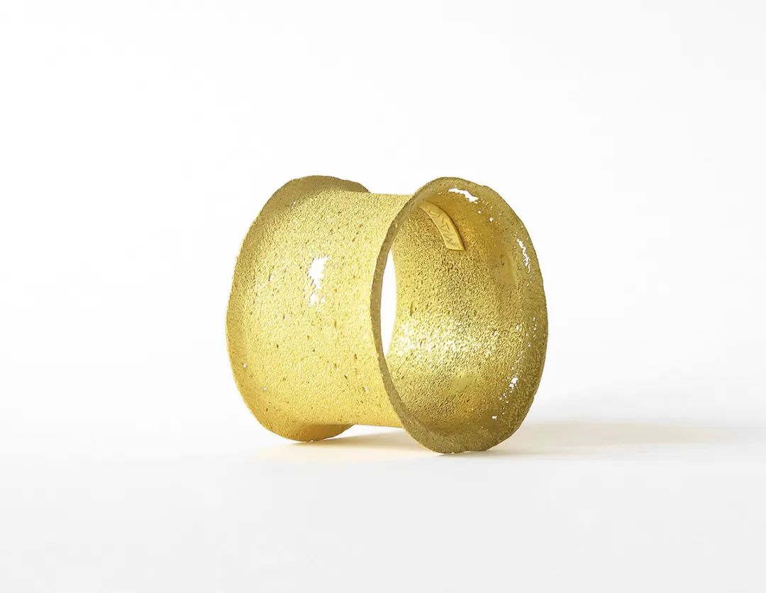 Yumiko Matsunaga 將紡織品、金屬雕塑和首飾方面的綜合技能,在她精致的空心墊狀搪瓷銅器皿中體現得淋漓盡致。