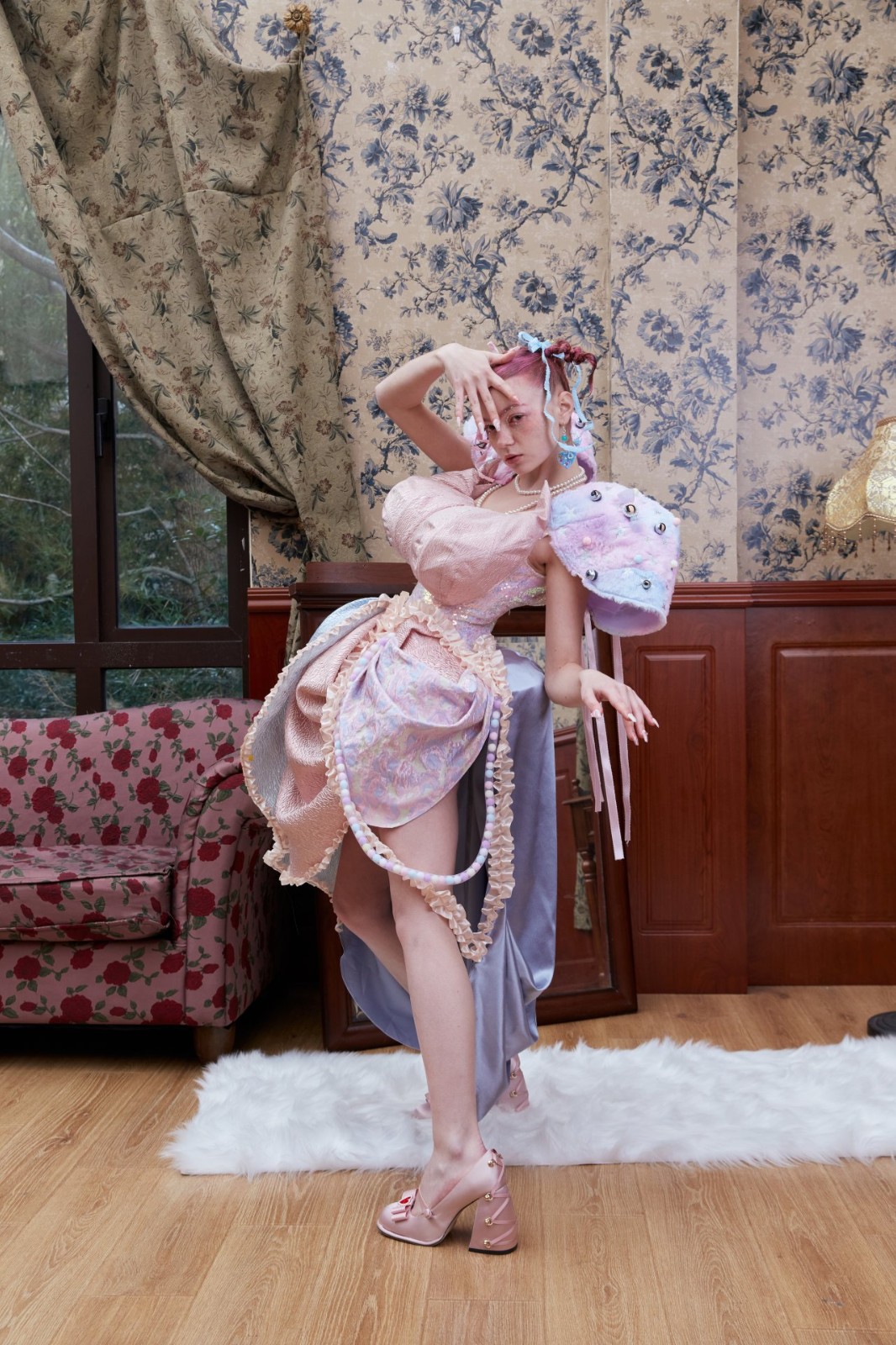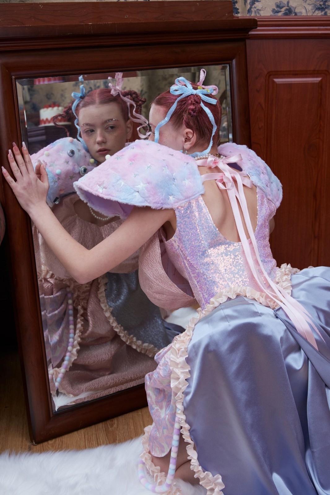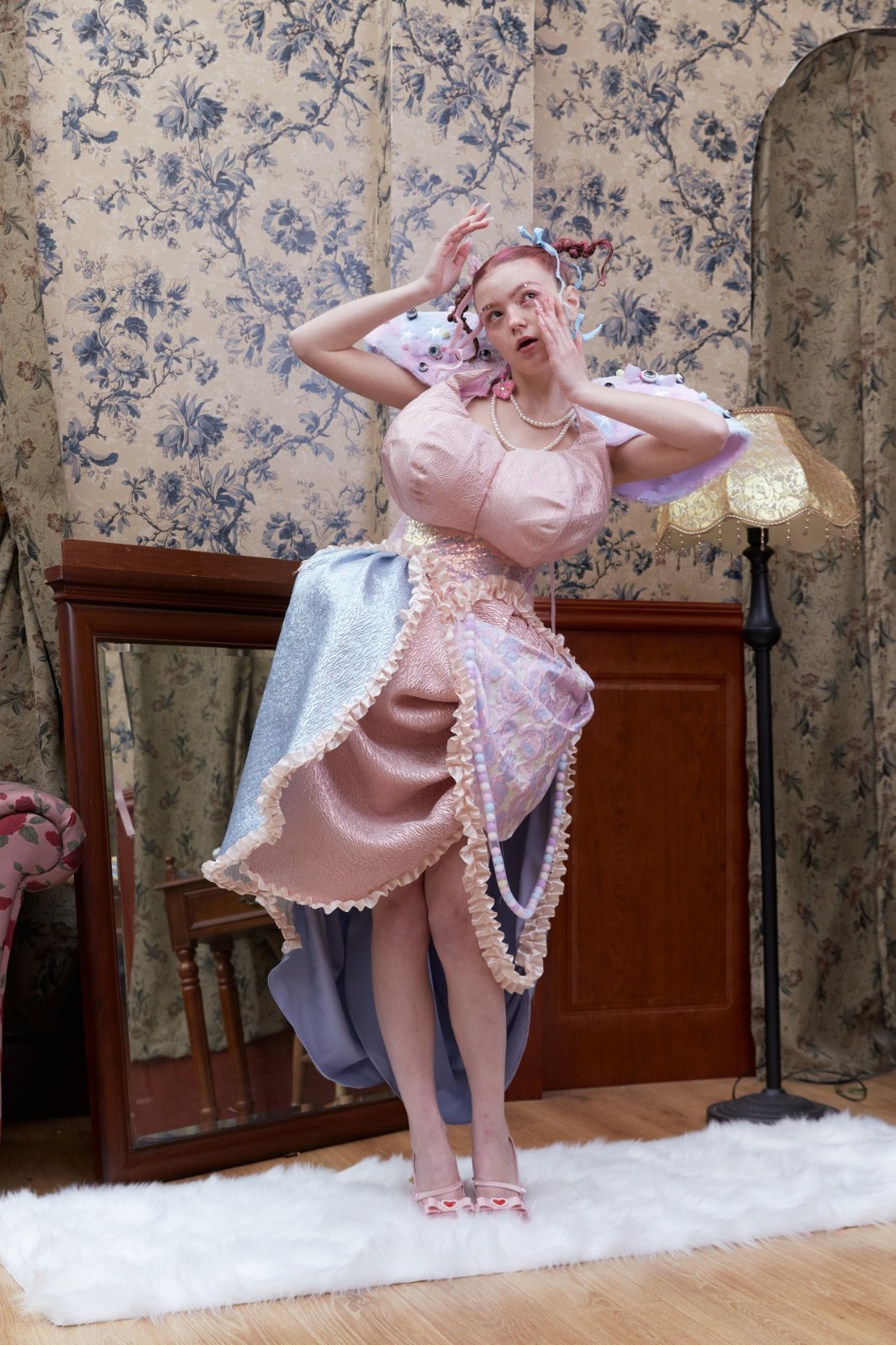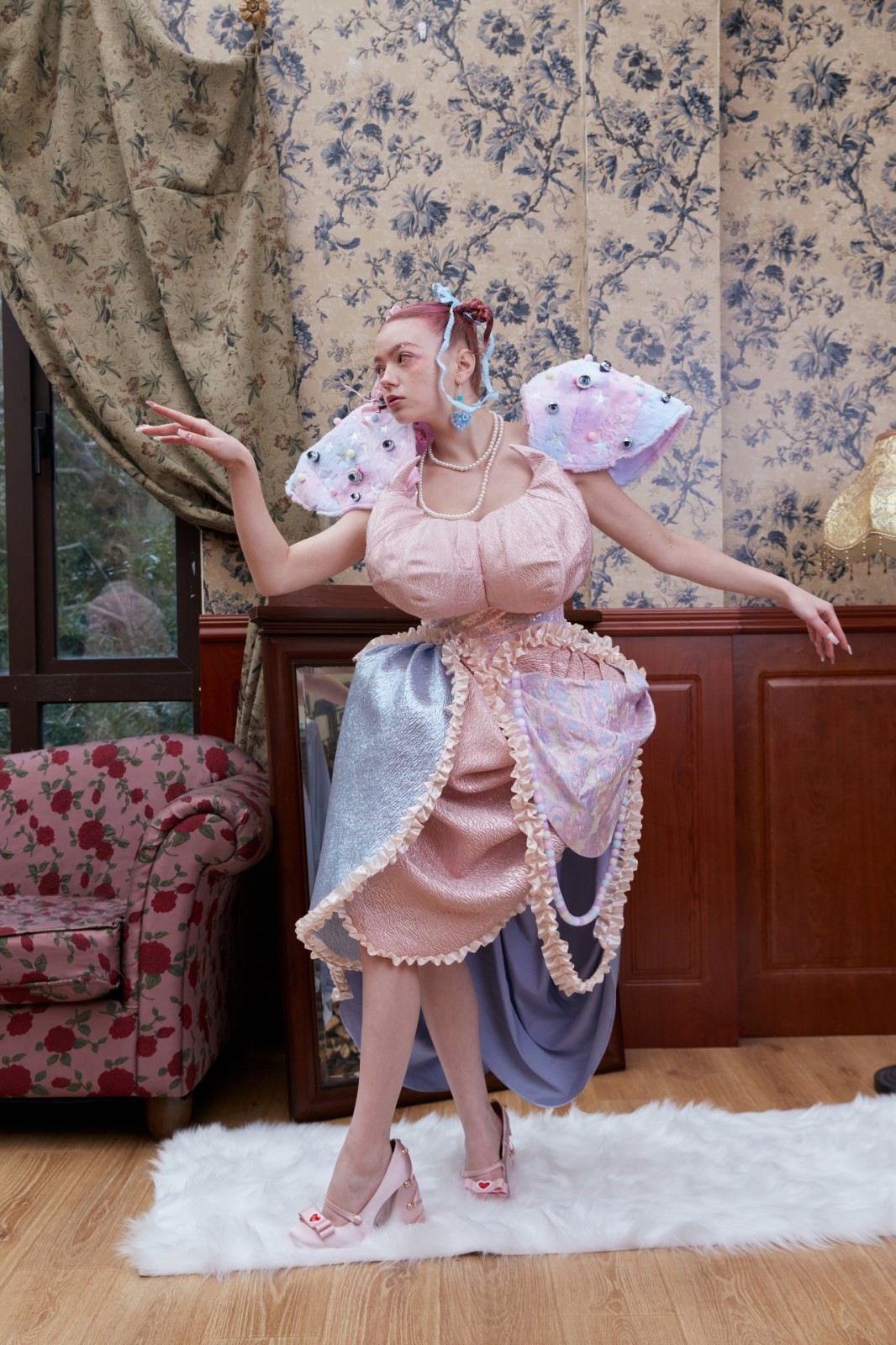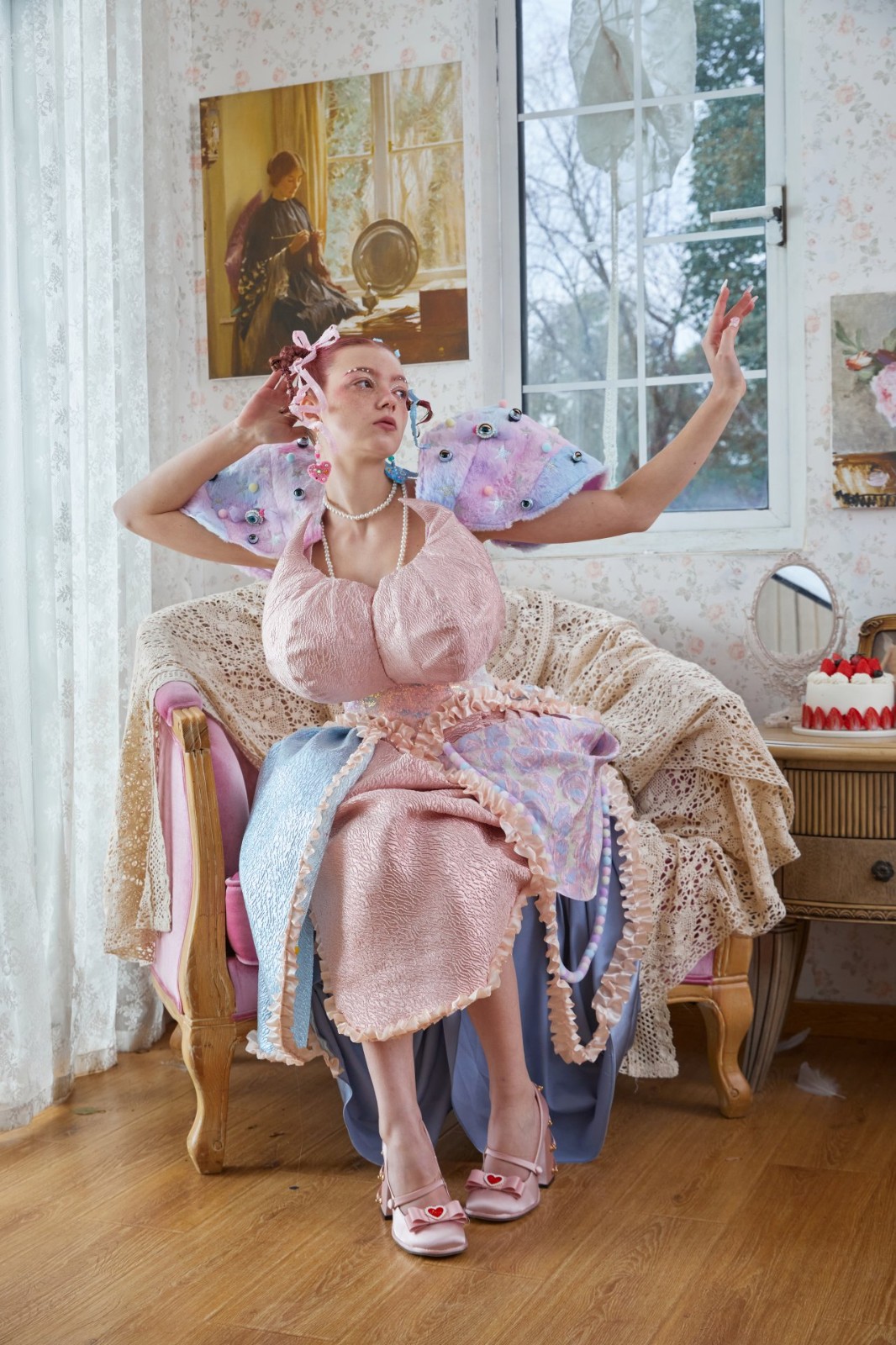 在《女巫娃娃》中,我以夢為靈感結(jié)合梅蘭妮 馬丁內(nèi)茲(Melanie Martinez)的音樂電影《K-12》中即甜美又古怪的風格去展示社會對于女性的物化與霸凌。我嘗試了使用非常規(guī)材料去展現(xiàn)部分服裝,例如:假發(fā),眼睛,牙齒,粘土等等。最后我設(shè)計制作完成兩套成衣。成衣的拍攝選擇一個“復(fù)古”的別墅中的置景,來比如社會對女性的固有印象與看不見的禁錮枷鎖。