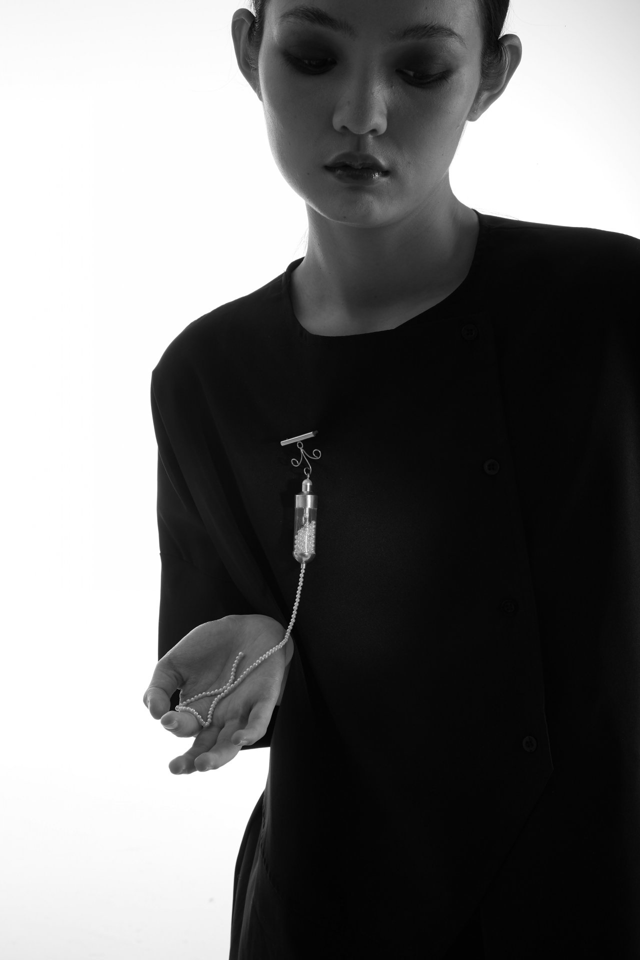 《閃爍的水滴》系列作品的靈感來自于我手臂上的一個疤痕,這個疤痕是在我生病期間由留置針留下的。在我住院治療的一年里,這根留置針一直保留在我的手臂上。隨著時間的流逝,我逐漸覺得它就像是一件飾品被佩戴在我的手臂上。因此,我開始思考將醫(yī)療器械轉(zhuǎn)化為首飾的可能性。在這個項目中,我的三件作品分別來源于與自身經(jīng)歷相關(guān)的三件醫(yī)療器械:輸液器、留置針和醫(yī)用貼紙。并在作品中加入了珍珠和水晶等材料來表現(xiàn)輸入身體的藥品和我的血液,使作品在還原使用過程的同時也增強了其作為首飾的裝飾性。