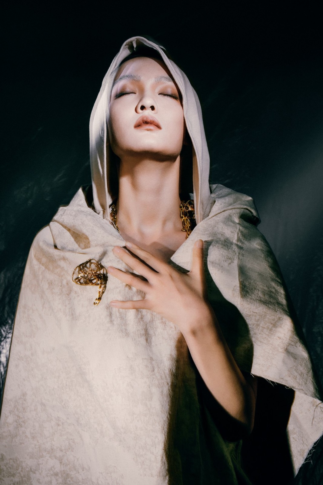 《鈴鼓》是一系列能隨著人體的運動而發出聲音的首飾。首飾和音樂有相似之處,都可以提高人們的精神滿足感和舒適感。受到中國傳統配飾步搖和禁步的啟發,當人佩戴它們行走時,配飾上的金玉相互碰撞會發出令人愉悅的聲音。于是我想通過人們不同的行為來探索人與首飾對象之間的關系,這可能會給觀眾帶來更有趣的穿著體驗和一種獨特的心理感受。