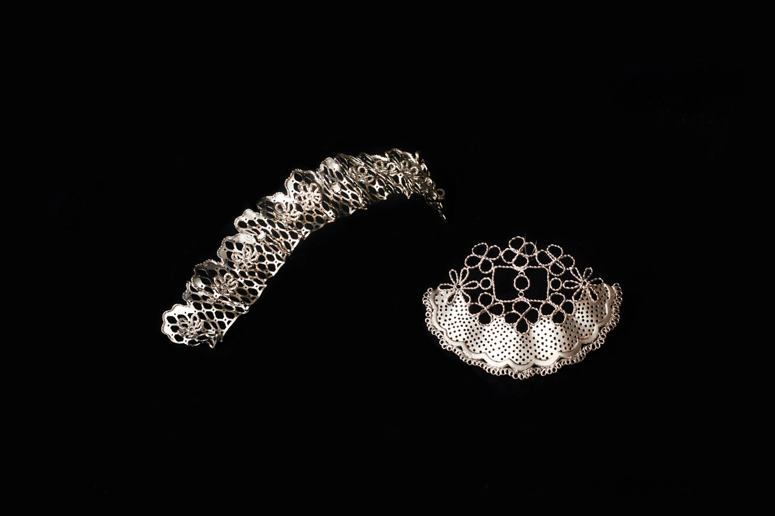 《Laced Armor》這個項目靈感來源我將洛麗塔裙作為日常服飾穿著的經歷。如今許多人認為穿著洛麗塔服飾是一種“媚男”的表現,因為許多洛麗塔模特都呈現白幼瘦的外貌。但在我看來,洛麗塔是女性以極度夸張的形式表達自己女性特質的一種方式。它幫助我表達自己的個性,并成為了屬于我自己的柔軟鎧甲。蕾絲是洛麗塔服飾中不可或缺的元素,因此我將其作為作品的主題。蕾絲通常被認為是柔弱易碎的,但我希望我的作品能表現出我和所有熱愛洛麗塔風格的女性的堅韌和頑強。因此,我決定用金屬重新表現衣服上的蕾絲,盡可能保留蕾絲的圖案和紋理,以營造出對比的效果。