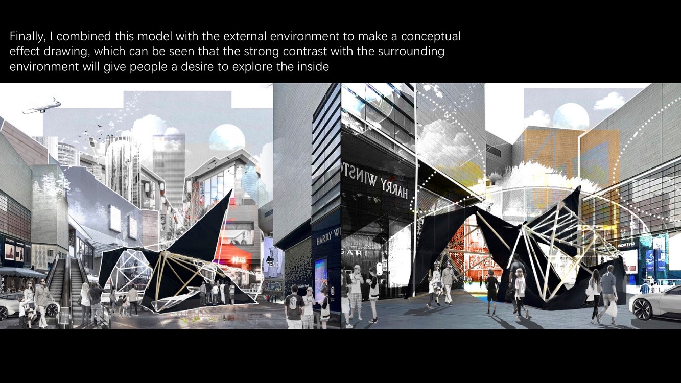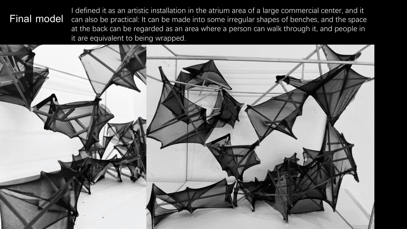 預科期間的第一個項目《soft space》的設計靈感來自于鹽田千春作品中對于的網和線使用。作為初學者我通過手部動作和絲網的翻折拉伸建立了對空間和建筑骨架的理解。通過模型構想了一個綜合商業中心中庭區域的藝術的裝置我希望他可以兼具實用性和觀賞性,因此我將他的一部分設計成:可一些不規則形狀的長凳,而后方空間設計為行走通道,體現了我在模型制作期間對包裹這一視覺語言的運